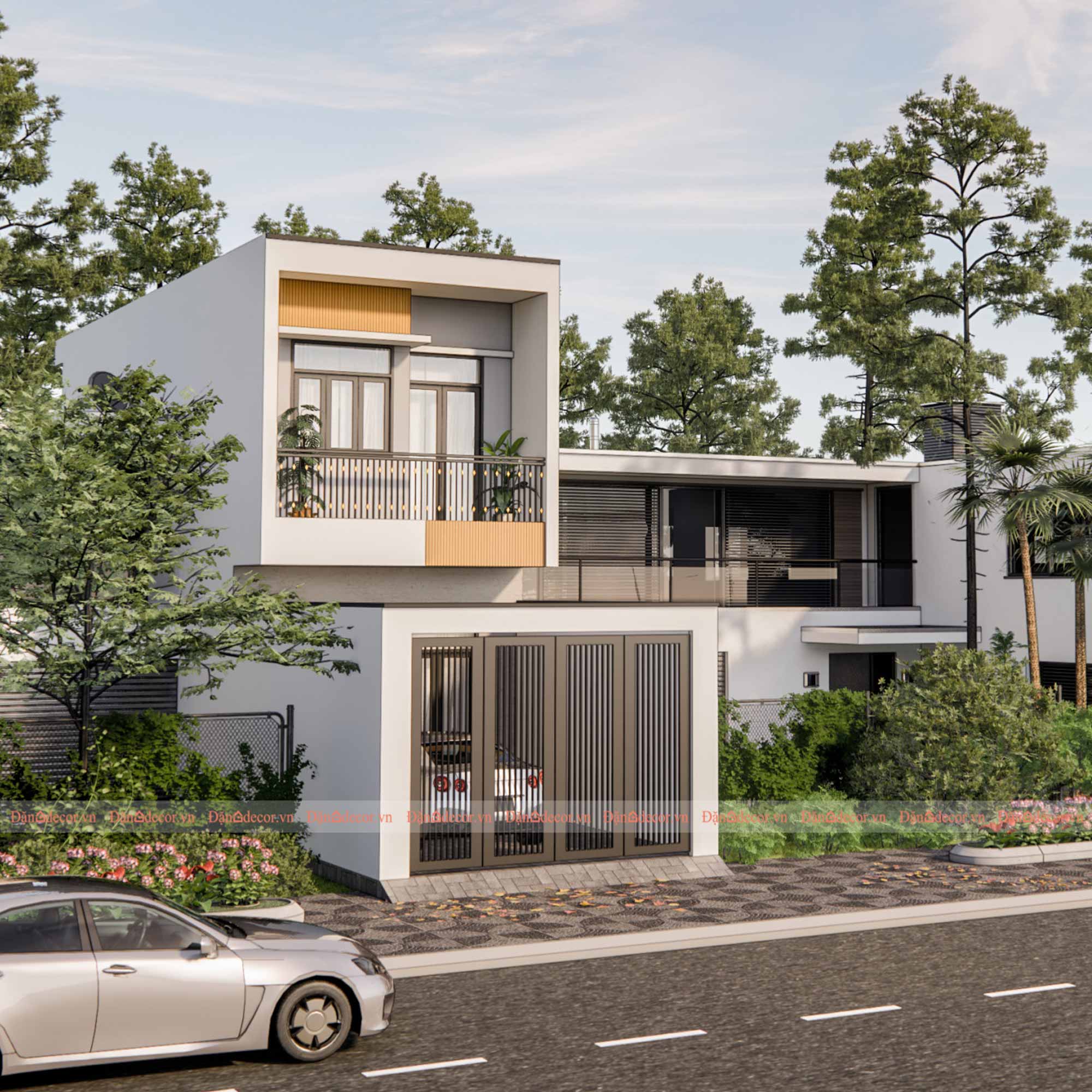 Với 1 trệt và 1 lầu, ngôi nhà này sử dụng màu trắng làm màu chủ đạo, tạo ra một cảm giác trang nhã và sạch sẽ. Màu trắng mang lại cảm giác rộng rãi và tươi sáng cho không gian, đồng thời tạo điểm nhấn cho sự tinh tế và sự đẹp mắt của ngôi nhà. Sơn xám được sử dụng như một điểm nhấn trong thiết kế, mang đến sự hiện đại và độc đáo cho ngôi nhà. Với sự kết hợp hài hòa giữa màu trắng và sơn xám, ngôi nhà trở nên tinh tế và thu hút ánh nhìn. Ốp gỗ nhựa trang trí được sử dụng để tăng thêm sự ấm cúng và sang trọng cho ngôi nhà. Gỗ nhựa mang lại vẻ đẹp tự nhiên và cảm giác mềm mại, đồng thời có khả năng chống mối mọt và chịu được điều kiện thời tiết khắc nghiệt.