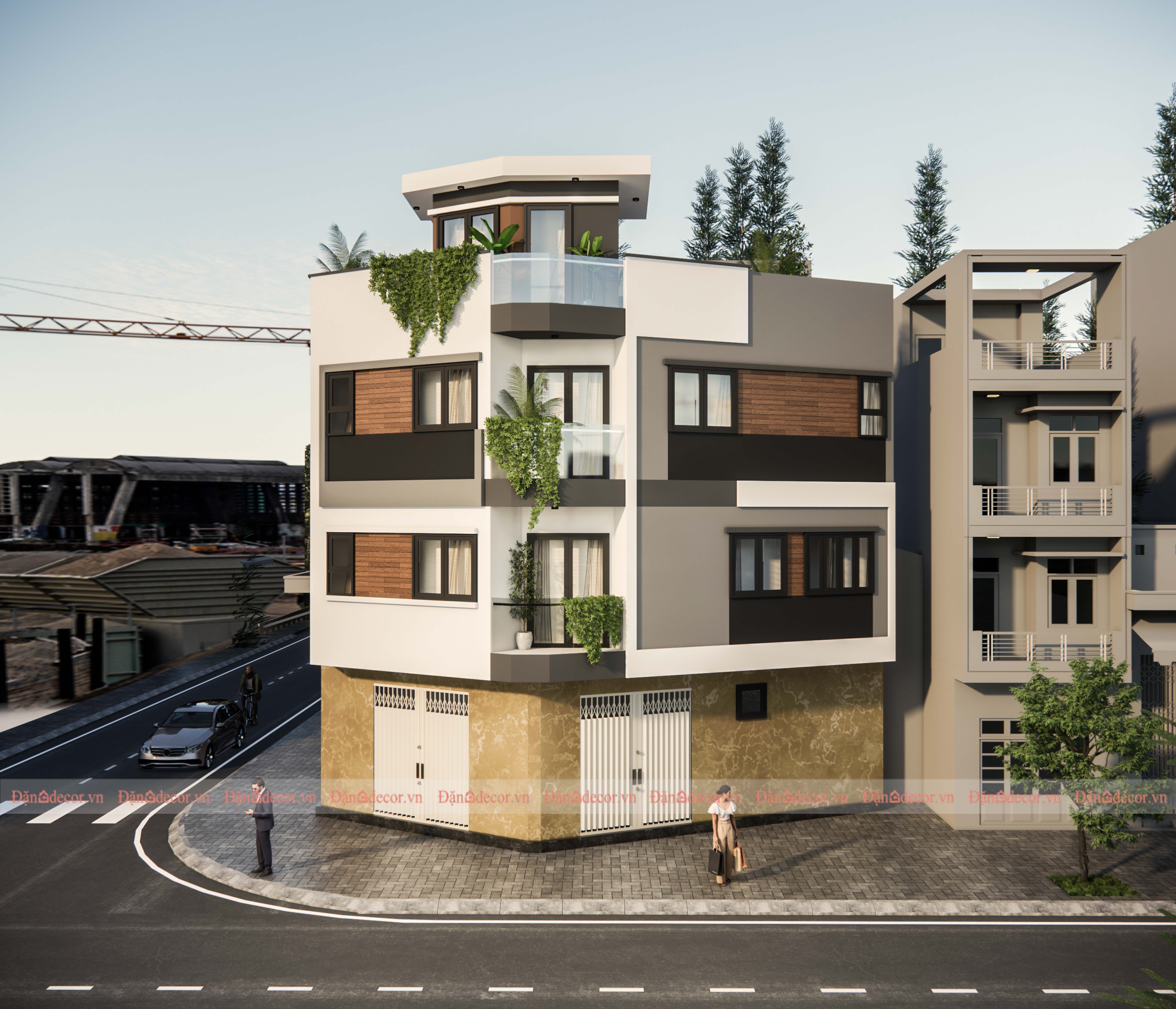 Thiết kế phối cảnh 3D mặt tiền ngôi nhà theo phong cách hiện đại, giả biệt thự, sử dụng những gam màu trung tính như: nâu, xám, trắng, đen,... kết hợp lan can kính cường lực, mang tới 1 tổng thể thời thượng, mạnh mẽ.