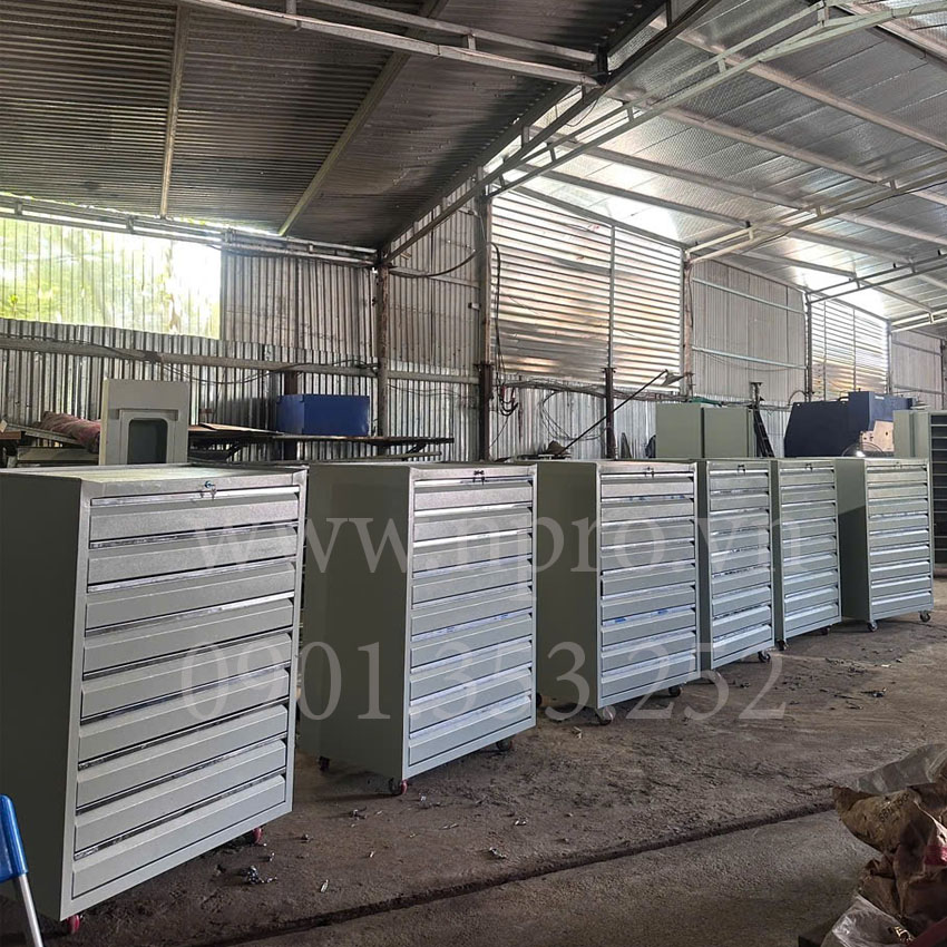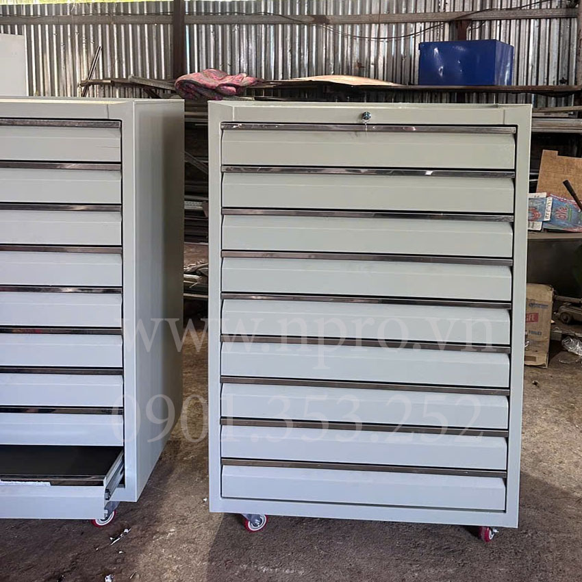 Tủ đồ nghề 9 ngăn Tủ đựng đồ nghề 9 ngăn kéo có bánh xe tiện di chuyển. Đây là dòng tủ đựng đồ nghề được sử dụng phổ biến trong các xưởng sản xuất, gia công cơ khí, nhà máy, tiệm sửa xe máy, gara ô tô và hộ gia đình hiện nay. Tủ đựng đồ nghề 9 ngăn được sản xuất dày dặn, chắc chắn và phân phối trên toàn quốc.