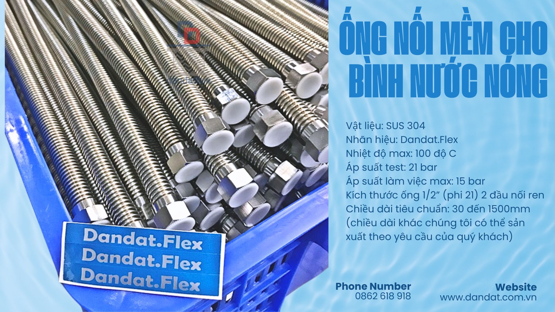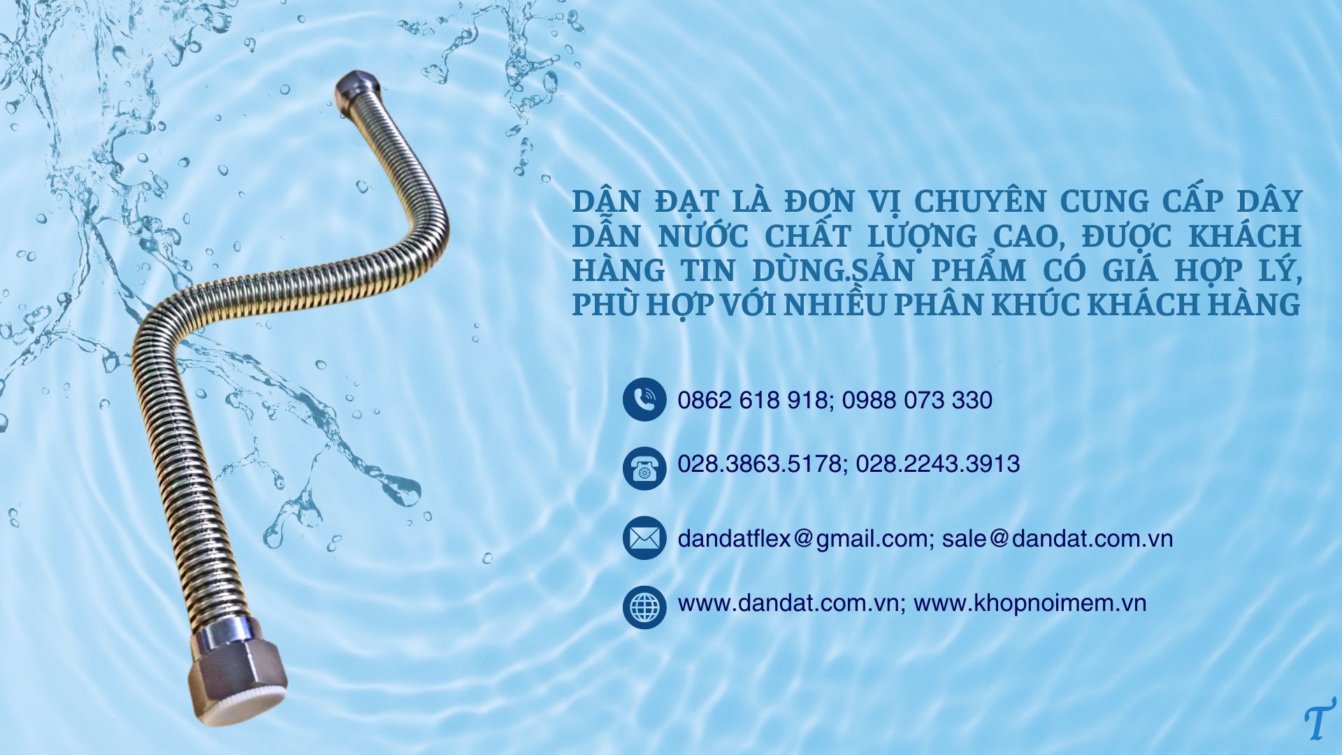 3. Ứng Dụng Của Dây Cấp Nước Inox Dân Đạt • Hệ thống cấp nước gia đình: Kết nối vòi sen, chậu rửa, bồn cầu, máy giặt, máy nước nóng lạnh. • Công trình dân dụng & công nghiệp: Hệ thống cấp nước cho tòa nhà, nhà hàng, khách sạn. • Lắp đặt hệ thống lọc nước: Đảm bảo nguồn nước sạch, không bị ảnh hưởng bởi các chất độc hại. 4. Mua Dây Cấp Nước Inox Dân Đạt Ở Đâu? Dân Đạt là thương hiệu uy tín chuyên cung cấp dây cấp nước inox chất lượng cao với giá cả cạnh tranh. Quý khách có thể tìm mua tại: • Website chính thức của Dân Đạt. • Tại nhà máy, cửa hàng.. 5. Kết Luận Dây dẫn nước inox Dân Đạt là lựa chọn hoàn hảo cho hệ thống cấp nước nóng lạnh nhờ vào độ bền cao, khả năng chịu nhiệt tốt và an toàn cho sức khỏe. Nếu bạn đang tìm kiếm một sản phẩm chất lượng, bền bỉ và đáng tin cậy, đừng bỏ qua dây cấp nước inox của Dân Đạt! Phòng kinh doanh: 028.3863.5178