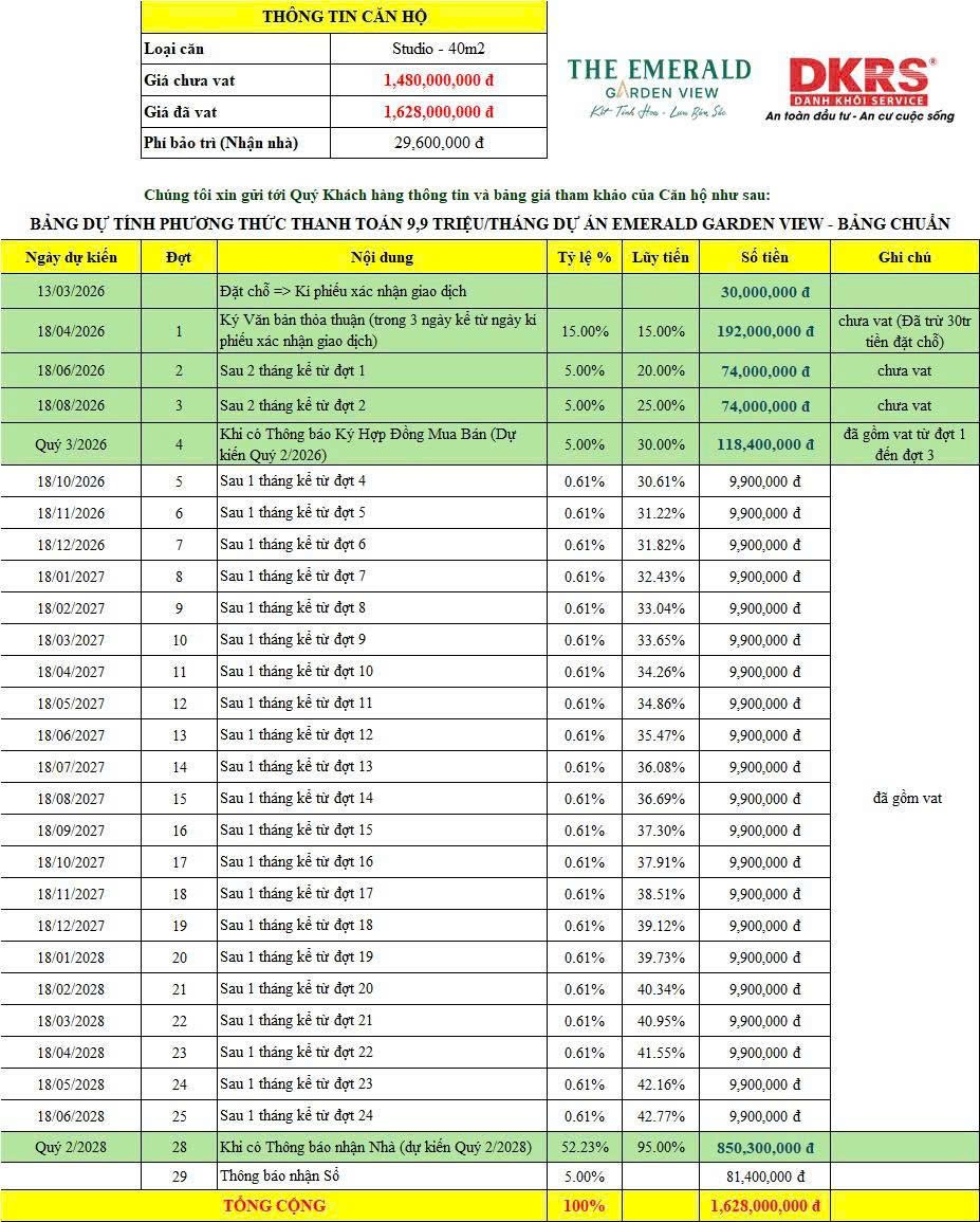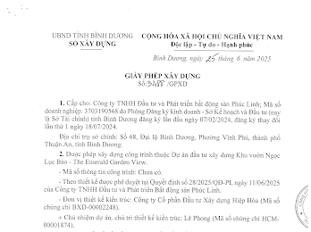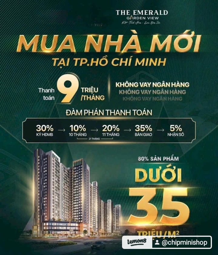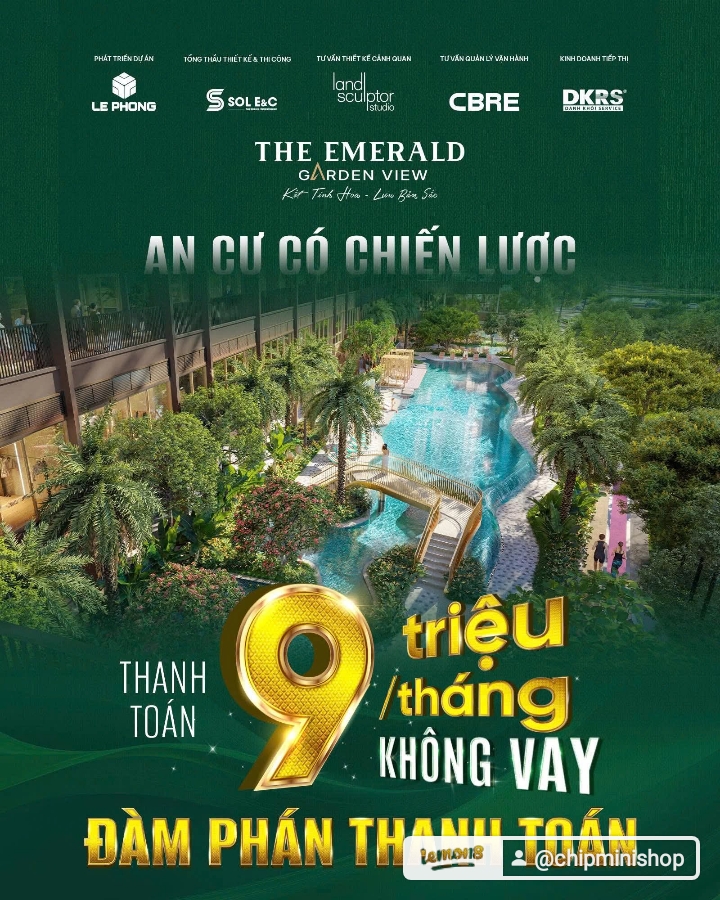 Căn hộ xanh TOD tại TP.HCM “The Emerald Garden View“ Mặt tiền đường Nguyễn Chí Thanh, P. Thuận An, TP.HCM TỔNG QUAN DỰ ÁN: Tên thương mại: 𝗧𝗵𝗲 𝗘𝗺𝗲𝗿𝗮𝗹𝗱 𝗚𝗮𝗿𝗱𝗲𝗻 𝗩𝗶𝗲𝘄 - Đơn vị phát triển: Lê Phong Group - Thiết kế & thi công: SOL E&C - Thiết kế cảnh quan: Land Sculptor Quản lý vận hành: CBRE - Quy mô tổng thể: - Khu đất 2ha - 25 tầng nổi – 2 tầng hầm - 2.000 căn hộ - Loại hình: Căn hộ – TMDV- Condotel -Căn studio: 36-48m2 -Căn 1PN-1PN+: 50-57m2 -Căn 2PN: 64-68m2 -Căn 3PN: 83m2