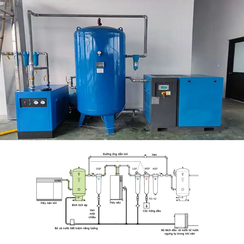 Thông số kỹ thuật Công suất mô tơ: 7.5 HP Điện áp: 380V/50Hz Cỡ xilianh: 65×2, 51X1 Bình chứa: 500 lít Tốc độ làm việc: 1150 v/phút Áp suất sử dụng: 12,5 kg/cm2 Lưu lượng: 366 L/phút