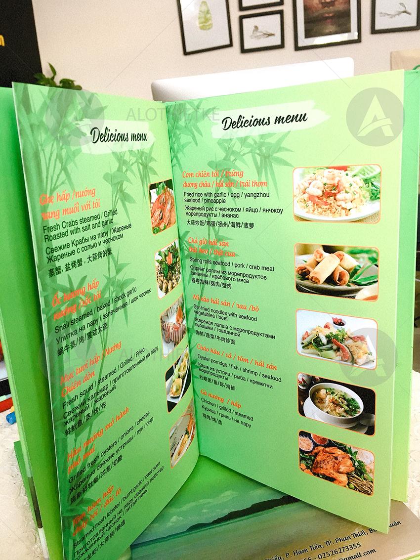 Với dịch vụ in menu giấy bồi tại Phan Thiết của Alothietke với đội ngũ thiết kế và in ấn đầy kinh nghiệm sẽ mang đến cho khách hàng cuốn menu giấy bồi độc đáo, ấn tượng phù hợp với đẳng cấp của nhà hàng.