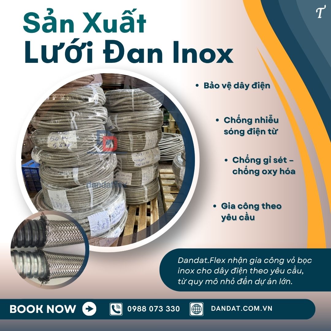 Dandat.Flex – Đơn vị gia công lưới inox bọc dây điện uy tín • Gia công theo yêu cầu: Kích thước, độ dày lưới, kiểu đan linh hoạt. • Nguyên liệu inox cao cấp: Inox 304, 316 chống gỉ, chống ăn mòn. • Kinh nghiệm sản xuất lâu năm, đảm bảo chất lượng và tiến độ. • Giá thành cạnh tranh, tư vấn kỹ thuật miễn phí. 👉 Với lưới inox bọc dây điện chống nhiễu sóng do Dandat.Flex gia công, hệ thống điện của bạn sẽ vừa an toàn, bền bỉ vừa ổn định tín hiệu trong suốt quá trình sử dụng.