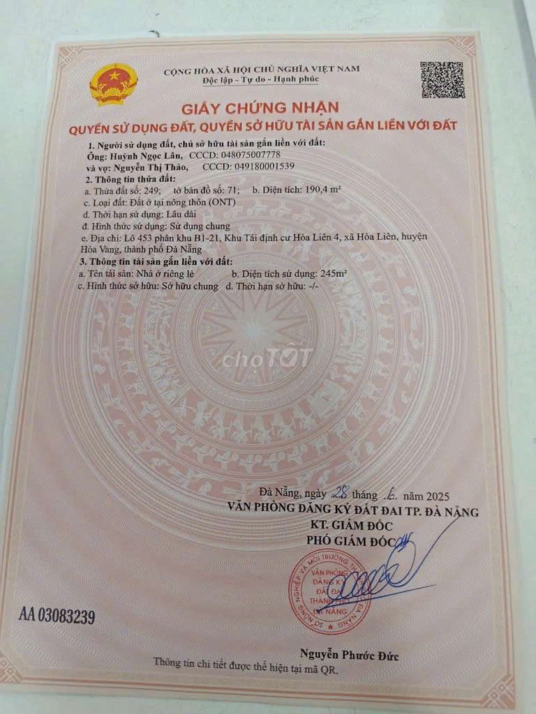 CẦN BÁN NHÀ DIỆN TÍCH 192 M2 TẠI 230, Trần Quốc Tảng, Phường Liên Chiểu, Đà Nẵng Mô tả chi tiết Chính chủ cần bán nhà ngay chợ Quan Nam Hoà Liên,gân cảng liên chiểu,khu kinh tế tự do,gầnkhu công nghệ cao,cách khu công nghiệp 1km,tiện ích sung quanh trường cấp 1 và cầp2 ,đồn công an 500m,nhà có sân rộng rãi 100m,để được 4 oto. cần bán .lhcc ***. không tiếp môi giới - Mặt tiền rộng, ô tô thoải mái đi lại, Hướng Đông Nam - Đường rộng 5,5m vỉa hè mổi bên 3m - Khu dân cư đông, yên tĩnh, an ninh tốt. Tiện ích xung quanh đầy đủ. - Gần siêu thị, gần trường, gần chợ…..giao thông thuận tiện các hướng - Nhà rất đẹp, sạch sẽ, rộng rãi, thoáng mát. - Giá : 5,3 tỷ Liên hệ để làm việc chính chủ : 0777400245