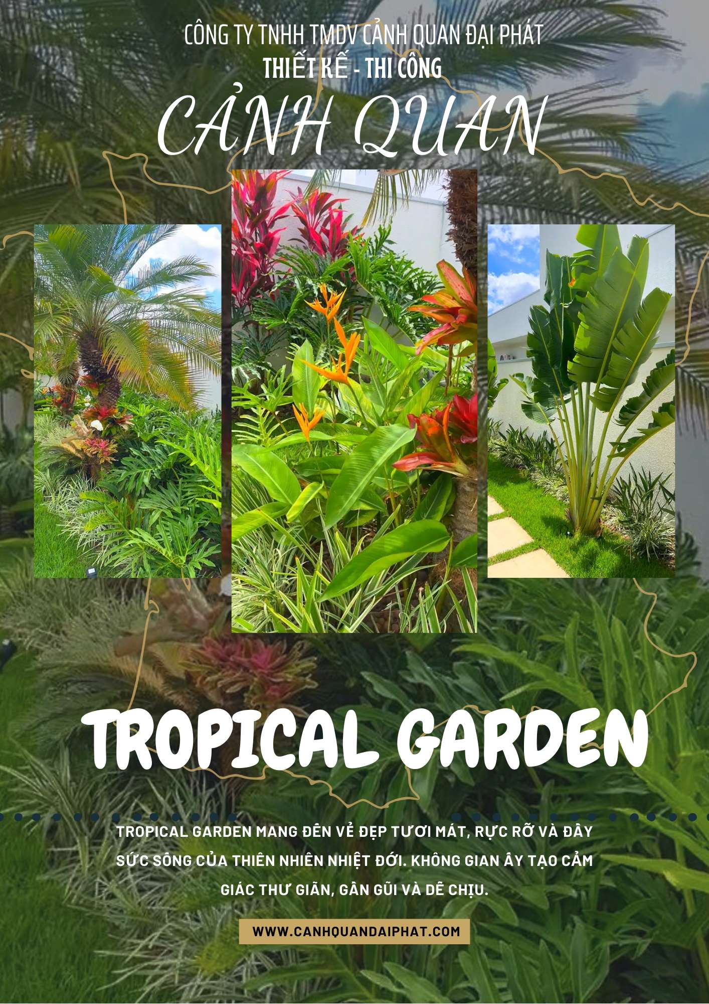✨ Cảnh Quan Đại Phát mang đến dịch vụ thiết kế & thi công cảnh quan sân vườn nhiệt đới trọn gói, giúp bạn: ✅ Tận hưởng không gian xanh mát, thư giãn mỗi ngày ✅ Bố trí cây xanh, đá tự nhiên, hồ nước hài hòa – tạo điểm nhấn ấn tượng ✅ Sử dụng cây nhiệt đới dễ sinh trưởng, ít tốn công chăm sóc ✅ Phù hợp nhiều loại hình: biệt thự, nhà phố, quán café, nhà hàng, homestay, nhà máy