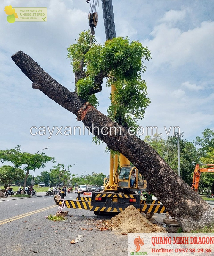 Bước 5: Cẩu và vận chuyển cây đến vị trí mới Cây sau khi bó bầu được nâng lên bằng xe cẩu chuyên dụng, cố định bằng dây vải mềm tránh làm trầy xước thân.