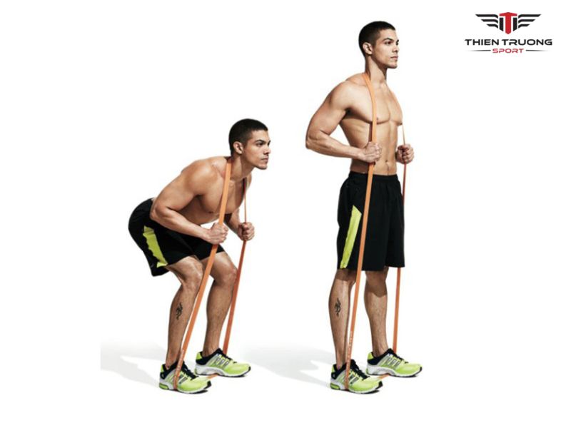 Squat kháng lực: Kéo dây lên vai và squat.