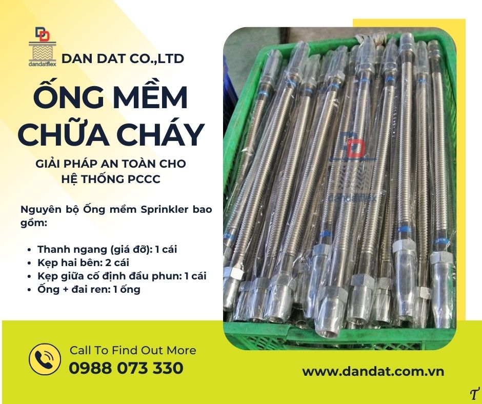 1. Giới Thiệu Về Ống Mềm Chữa Cháy (Ống Mềm Sprinkler) Ống mềm chữa cháy, hay còn gọi là ống mềm sprinkler/ ống dẫn nước chữa cháy/ dây mềm nối đầu phun sprinkle/khớp nối mềm PCCC, là một trong những thiết bị quan trọng trong hệ thống phòng cháy chữa cháy tự động. Với đặc tính linh hoạt, dễ lắp đặt và chịu áp lực cao, ống mềm chữa cháy Dân Đạt là lựa chọn hàng đầu cho các công trình cao tầng, nhà xưởng, trung tâm thương mại và các khu vực có yêu cầu phòng cháy nghiêm ngặt. 2. Vì Sao Nên Chọn Ống Mềm Cho Đầu Phun Chữa Cháy Dân Đạt? Dân Đạt tự hào là thương hiệu hàng đầu trong lĩnh vực cung cấp ống mềm inox chữa cháy, ống mềm nối sprinkler, cam kết chất lượng và độ bền vượt trội. Dưới đây là những lý do bạn nên lựa chọn sản phẩm của chúng tôi: 🔥 Chất Liệu Cao Cấp: Dây mềm chữa cháy làm từ inox 304 hoặc inox 316, có khả năng chống ăn mòn, chịu nhiệt và áp suất cao.Lớp vỏ bảo vệ giúp hạn chế rò rỉ, đảm bảo an toàn tối đa khi sử dụng. 🔥 Độ Bền Cao, Linh Hoạt Trong Thi Công Thiết kế mềm dẻo, dễ dàng uốn cong theo không gian lắp đặt, dây nối mềm inox cho sprinkler giúp tối ưu hiệu suất hệ thống chữa cháy.Độ bền cao, tuổi thọ lên đến hàng chục năm, giảm thiểu chi phí bảo trì. 🔥 Tiêu Chuẩn Quốc Tế Ống nối mềm sprinkler Dân Đạt đạt các tiêu chuẩn an toàn phòng cháy chữa cháy UL, FM, NFPA.Đáp ứng yêu cầu nghiêm ngặt trong lắp đặt hệ thống PCCC tại các tòa nhà, nhà máy, kho xưởng.