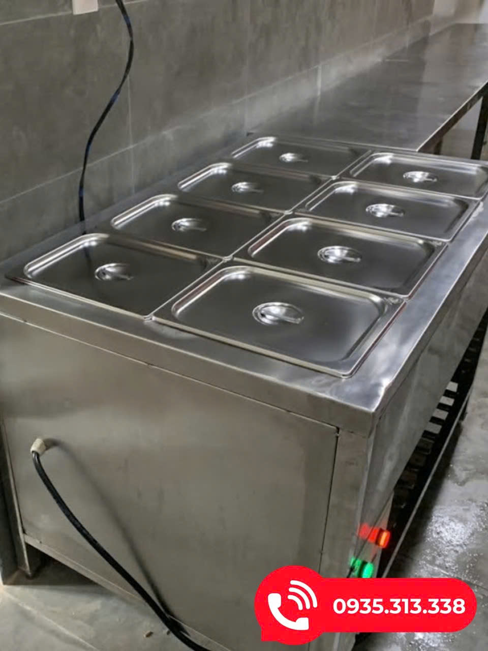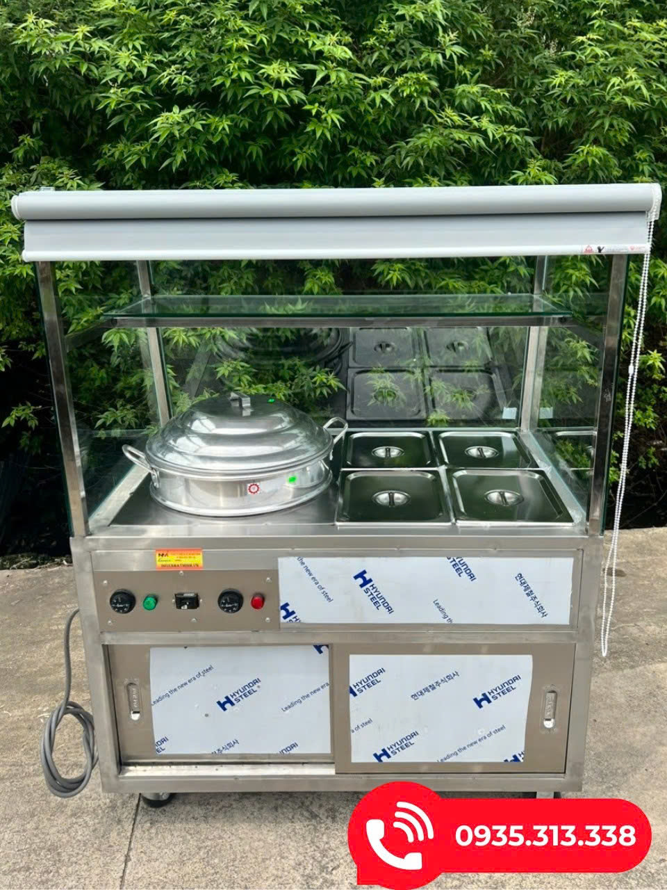 Kích thước: 1150 x 750 x 1460 mm (Dài x Rộng x Cao) – Kích thước rộng rãi, đáp ứng nhu cầu sử dụng lớn. Chất liệu: Inox 304 dày ~1.0 mm, chắc chắn, bền bỉ, dễ dàng vệ sinh. Kính cường lực ốp 3 mặt, sang trọng, hiện đại, dễ dàng quan sát. Cấu tạo: Lưới chắn côn trùng, đảm bảo vệ sinh. 4 khay GN 1/2 có nắp, kích thước 327 x 265 x H65 mm, tiện lợi khi sử dụng. 1 nồi xôi có nắp, đa dạng lựa chọn hâm nóng. 4 bánh xe xoay 360 độ, di chuyển linh hoạt.