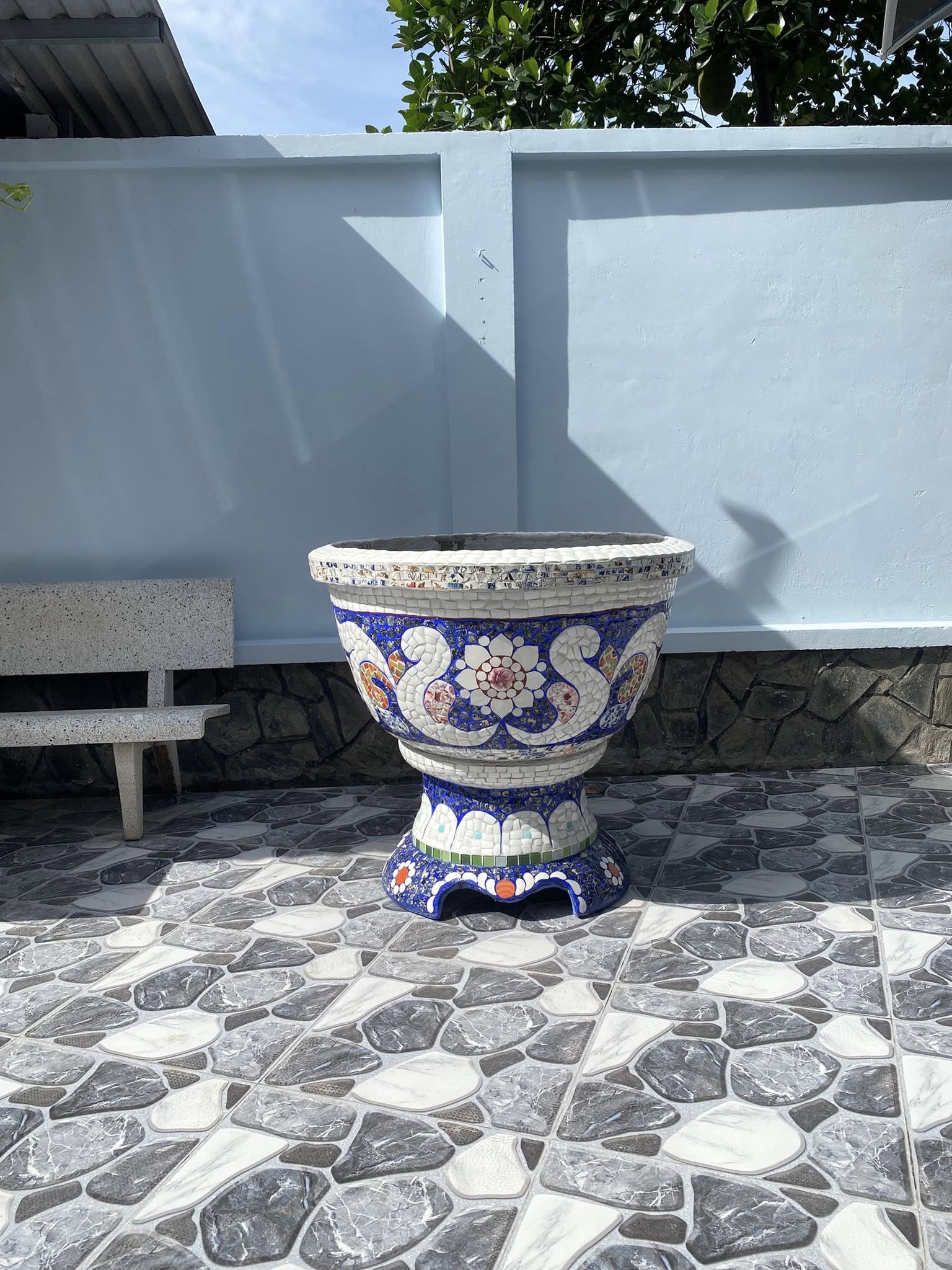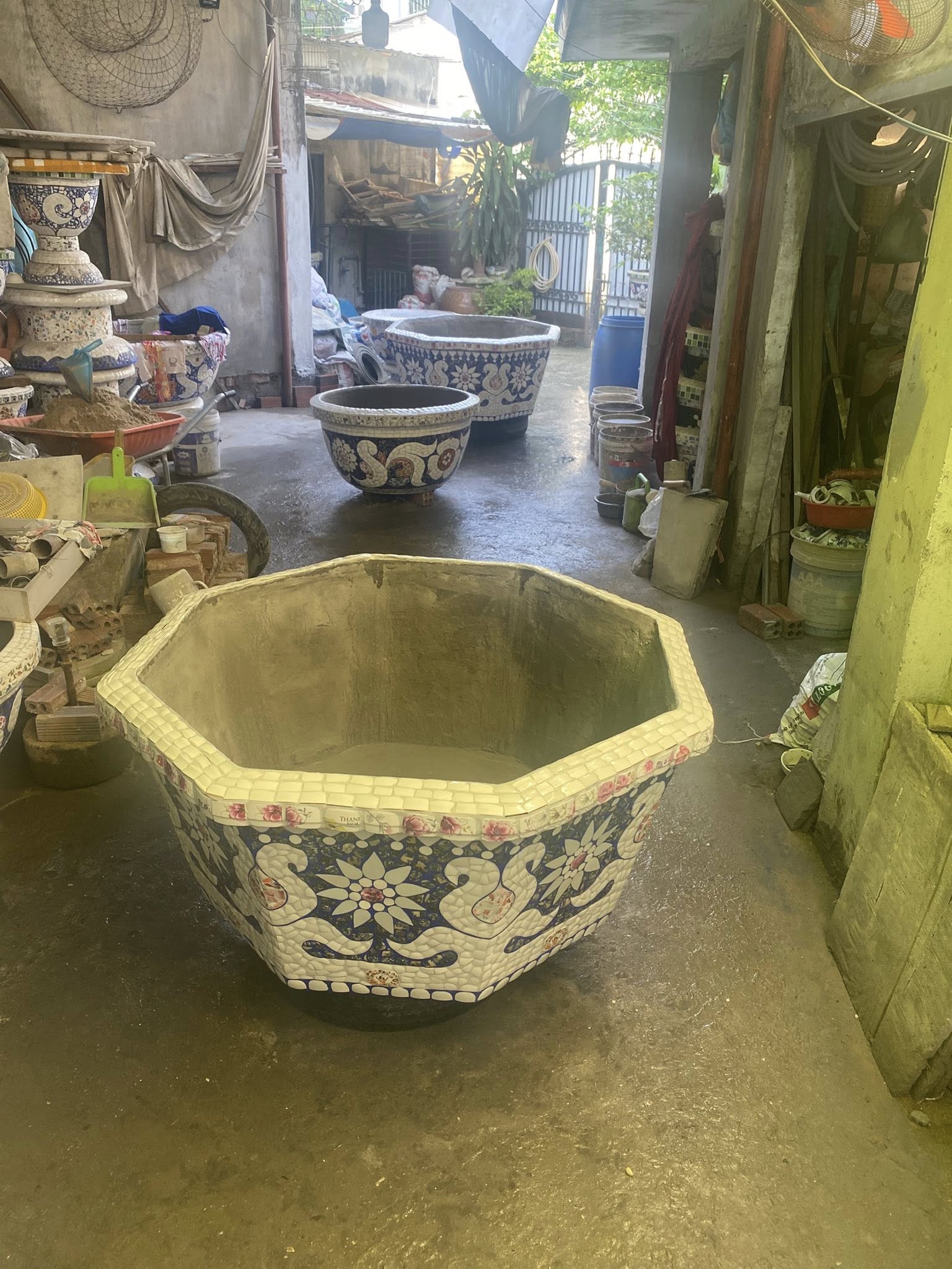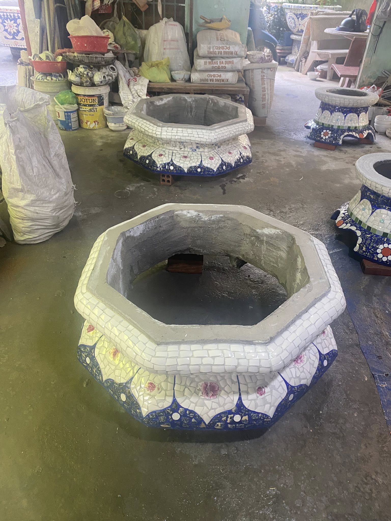 Sau khi dán miểng xong thì “chà ron” bằng ximăng trắng và vẽ màu cho tiệp theo đường màu của hoa văn... Với nhiều công đoạn như vậy, việc làm chậu kiểng không thể do một hoặc hai người làm mà phải có đông người. Trung bình một chậu làm khoảng 10 ngày. Khách hàng liên hệ : -