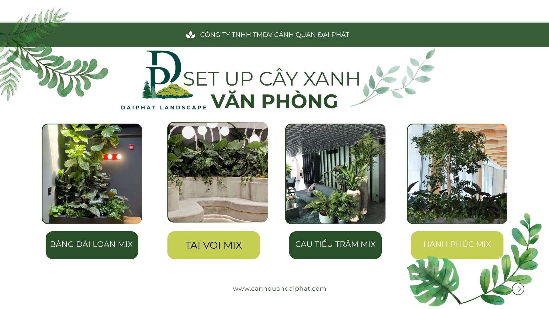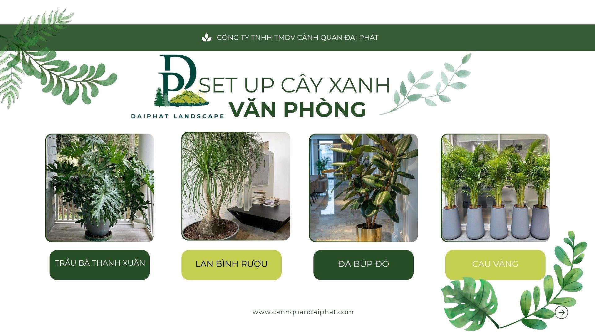 👉 Cảnh Quan Đại Phát chuyên: ✔️ Set up cây xanh văn phòng theo từng khu vực ✔️ Tư vấn cây phù hợp ánh sáng – phong thủy – ngân sách ✔️ Thi công nhanh gọn, thẩm mỹ cao ✔️ Chăm sóc & bảo dưỡng cây định kỳ