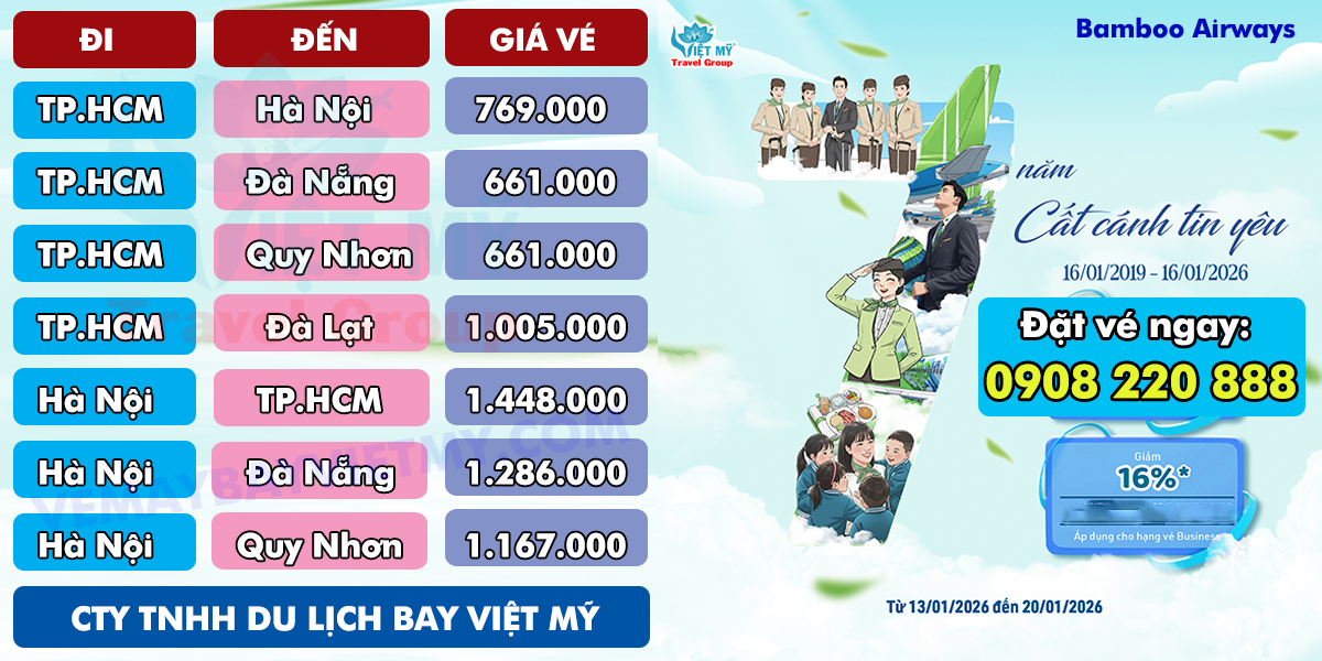 Trải qua 7 năm hình thành và phát triển, Bamboo Airways không ngừng nâng cao chất lượng dịch vụ, mở rộng mạng bay và mang đến những trải nghiệm bay an toàn – đúng giờ – thân thiện. Chương trình “Ưu đãi mừng 7 năm cất cánh” chính là lời tri ân đặc biệt gửi đến khách hàng đã luôn tin tưởng đồng hành tại Đại lý vé máy bay Việt Mỹ!
