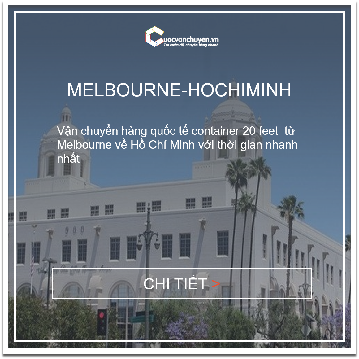 Đôi nét về cảng Melbourne Cảng Melbourne nằm trên cửa sông Yarra thuộc bang Victoria, Australia do một doanh nghiệp quốc doanh quản lí, đó là Tổng công ty cảng Melbourne. Được xây dựng vào năm 1889, đây là một cảng hàng hóa tổng hợp và cũng là cảng container lớn nhất Australia. Lượng hàng container qua cảng chiếm gần 37% của tổng số lượng container thương mại trên toàn nước Úc. Cảng nằm trên một diện tích rộng 143.000 m². Hàng năm lượng tàu qua cảng Melbourne vượt hơn 3.500 lượt tàu. Đây cũng là một trung tâm quan trọng đối với các ngành sản xuất, tài chính, kinh doanh, thông tin liên lạc. Melbourne là một trong những cửa ngõ giao thương quan trọng của châu Á – Thái Bình Dương, đồng thời là một trong những vùng kinh tế phát triển nhanh nhất thế giới. Ngoài ra, cảng biển Melbourne cũng là cảng vận chuyển container lớn nhất nước Úc. Với vị trí gần trung tâm Melbourne, cảng được tăng cường trang thiết bị thường xuyên nhằm giúp quá trình vận chuyển hàng hóa tới châu Á – Thái Bình Dương được thuận tiện, dễ dàng. Giá cước vận chuyển hàng hóa Quốc tế từ Melbourne, Australia về Hồ Chí Minh: Thời gian vận chuyển từ Melbourne, Australia về Hồ Chí Minh: 18-22 ngày Tàu chạy thứ 4, 5, 6, Chủ Nhật hàng tuần