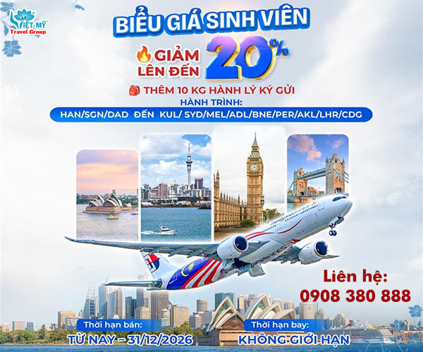 Malaysia Airlines giảm 20% giá vé cho Sinh viên, áp dụng trên nhiều đường bay quốc tế hấp dẫn. Đây là cơ hội lý tưởng để du học sinh, sinh viên quốc tế và sinh viên Việt Nam tiết kiệm chi phí di chuyển, học tập và khám phá thế giới tại Đại lý vé máy bay Việt Mỹ!