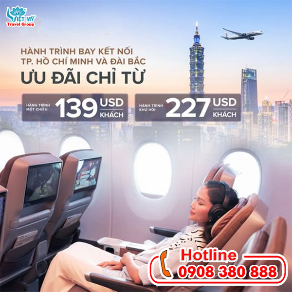 Đón đầu năm mới 2026, STARLUX Airlines ưu đãi vé đầu năm đi Đài Bắc vô cùng hấp dẫn cho hành trình bay kết nối TP. Hồ Chí Minh. Với mức giá chỉ từ 139 USD/khách, hành khách có cơ hội trải nghiệm dịch vụ hàng không 5 sao của STARLUX cùng hành trình bay tiện nghi, hiện đại và đúng giờ. Chương trình ưu đãi đầu năm là lựa chọn lý tưởng cho khách du lịch, du học sinh, người lao động và khách công tác có kế hoạch di chuyển đến Đài Loan trong thời gian sắp tới tại Đại lý vé máy bay Việt Mỹ!