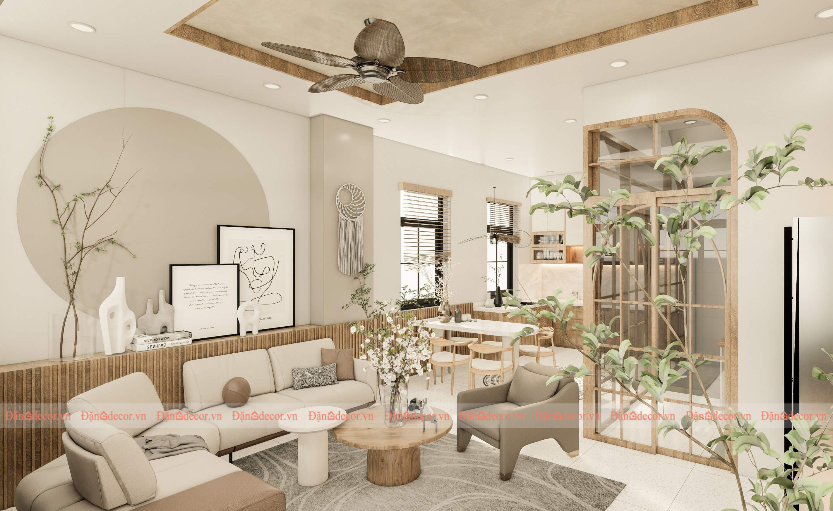 - Phòng khách và phòng bếp là hai không gian quan trọng trong một căn nhà, và việc thiết kế chúng theo phong cách hiện đại organic sẽ tạo nên một không gian sống ấm cúng và gần gũi với thiên nhiên. - Thiết kế phòng khách mở organic tại Vũng Tàu với tông màu chủ đạo là màu trắng, be cùng với vân gỗ tự nhiên, không gian này sẽ mang đến sự hài hòa và thoải mái cho cả gia đình và khách mời.