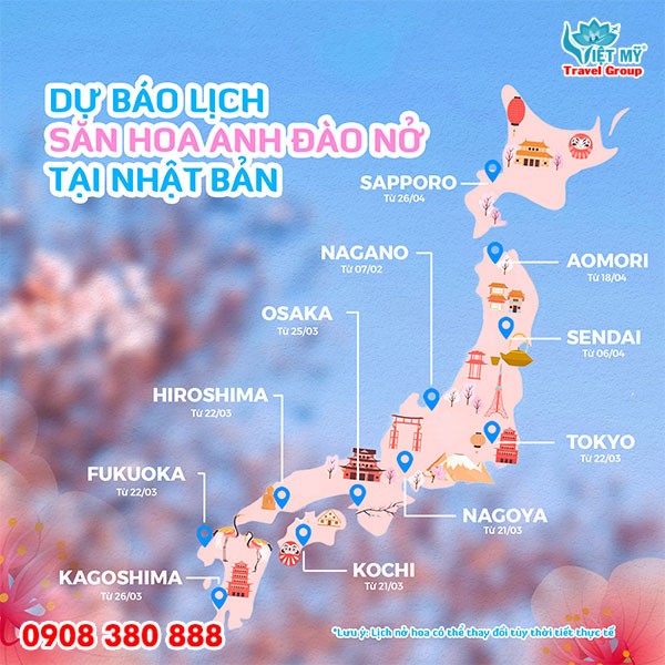 BẢNG DỰ BÁO HOA ANH ĐÀO NHẬT BẢN 2026 Thành phố Thời gian dự kiến nở Tokyo Từ 22/03 Nagoya Từ 21/03 Kochi Từ 21/03 Hiroshima Từ 22/03 Fukuoka Từ 22/03 Osaka Từ 25/03 Kagoshima Từ 26/03 Sendai Từ 06/04 Aomori Từ 18/04 Sapporo Từ 26/04