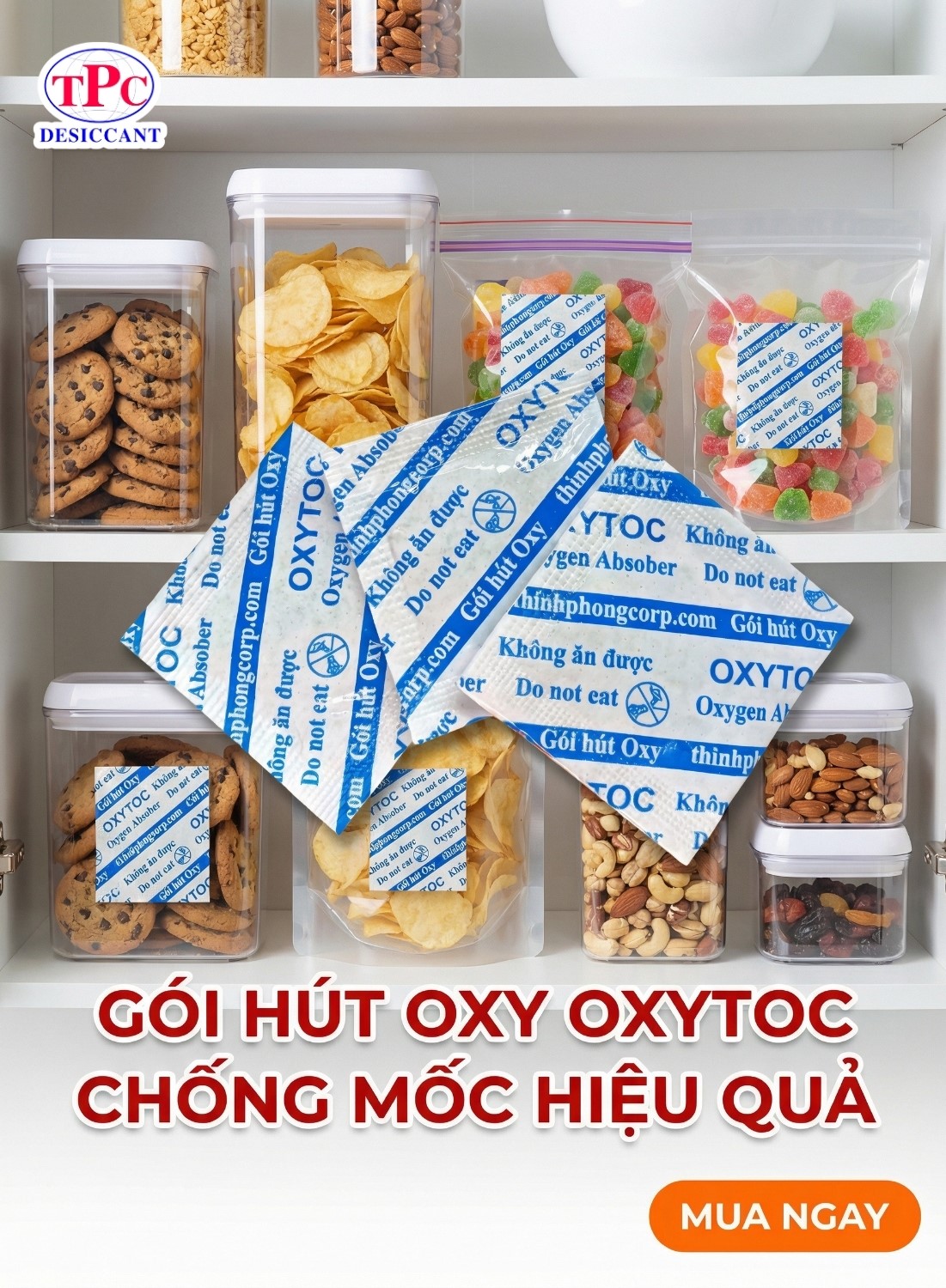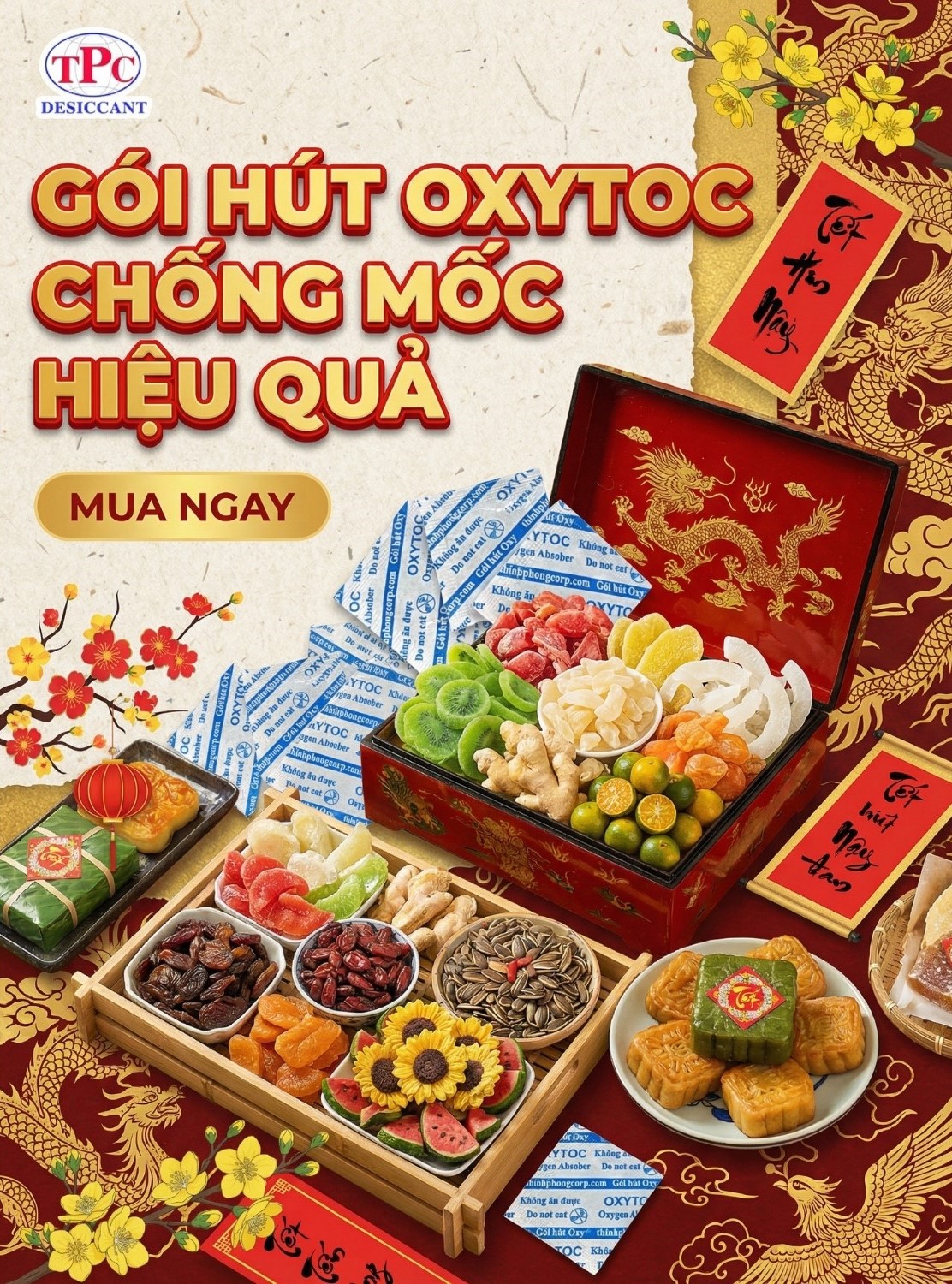 Khi bảo quản lâu, oxy dư trong bao bì là nguyên nhân khiến bánh kẹo, mứt Tết bị mốc, hôi dầu và giảm chất lượng. Gói chống mốc OXYTOC giúp hút oxy bên trong bao bì, hỗ trợ bảo quản bánh mứt ổn định hơn mà không cần dùng chất bảo quản.