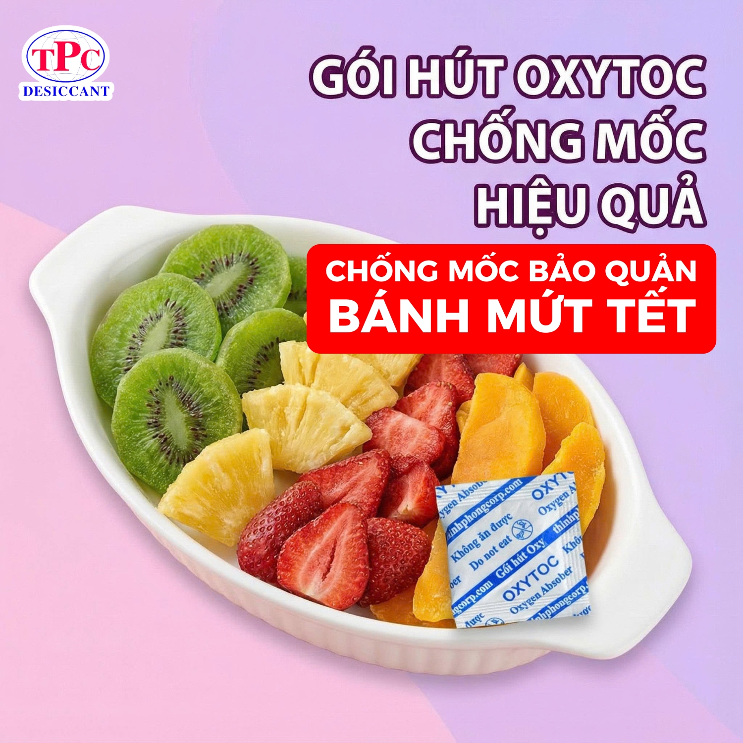 Trong quá trình lưu kho, oxy còn sót trong bao bì là nguyên nhân khiến bánh mứt bị mốc, hôi dầu và giảm chất lượng. Gói hút oxy OXYTOC giúp kiểm soát oxy từ bên trong, hỗ trợ chống mốc bánh kẹo mứt Tết hiệu quả mà không cần phụ gia.