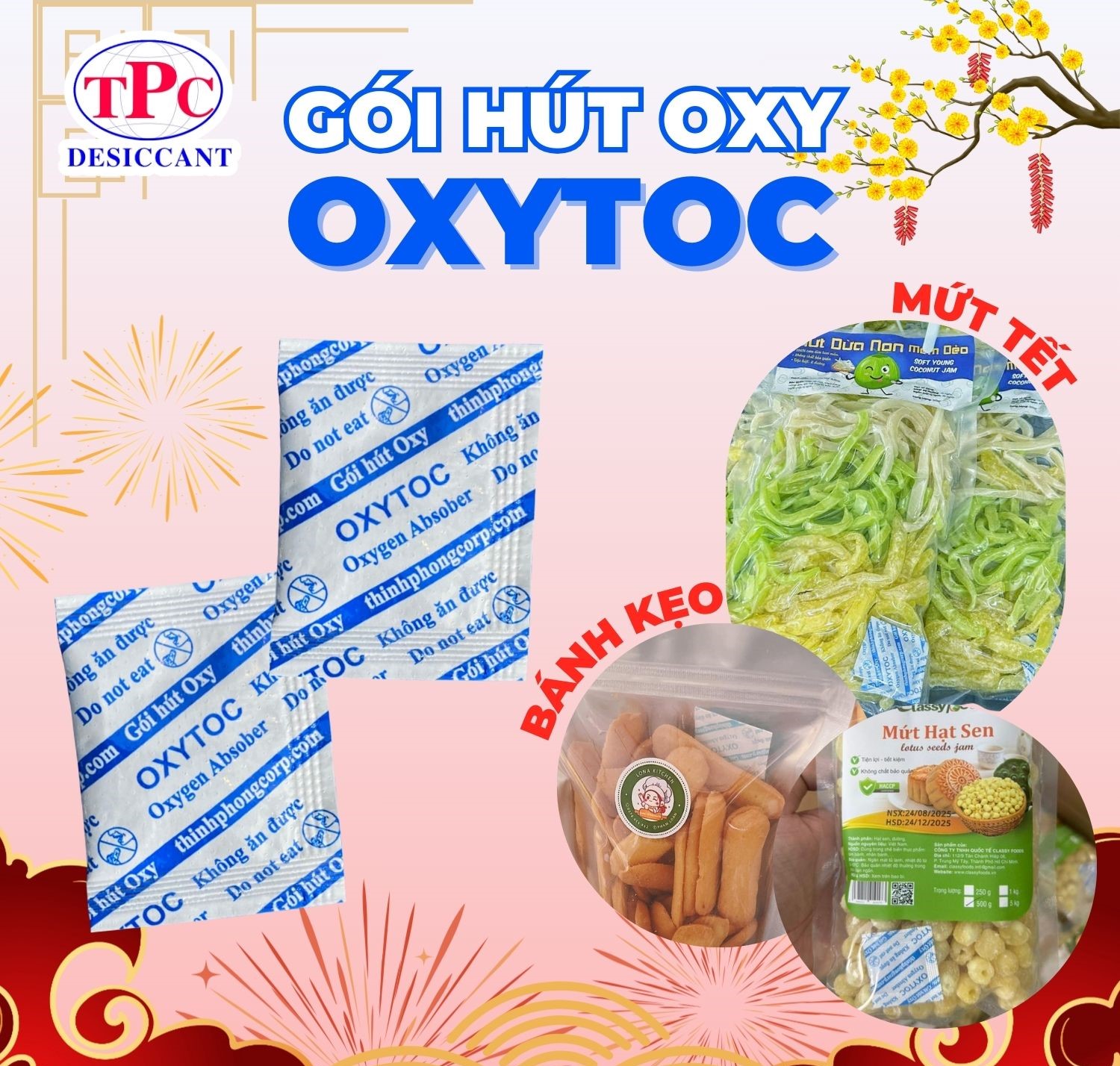 Trong quá trình lưu kho, oxy còn sót trong bao bì là nguyên nhân khiến bánh kẹo, mứt Tết dễ mốc và hôi dầu dù đã đóng gói kín. Gói hút oxy OXYTOC giúp giảm oxy trong bao bì, hỗ trợ chống mốc bánh mứt hiệu quả mà không cần dùng chất bảo quản.