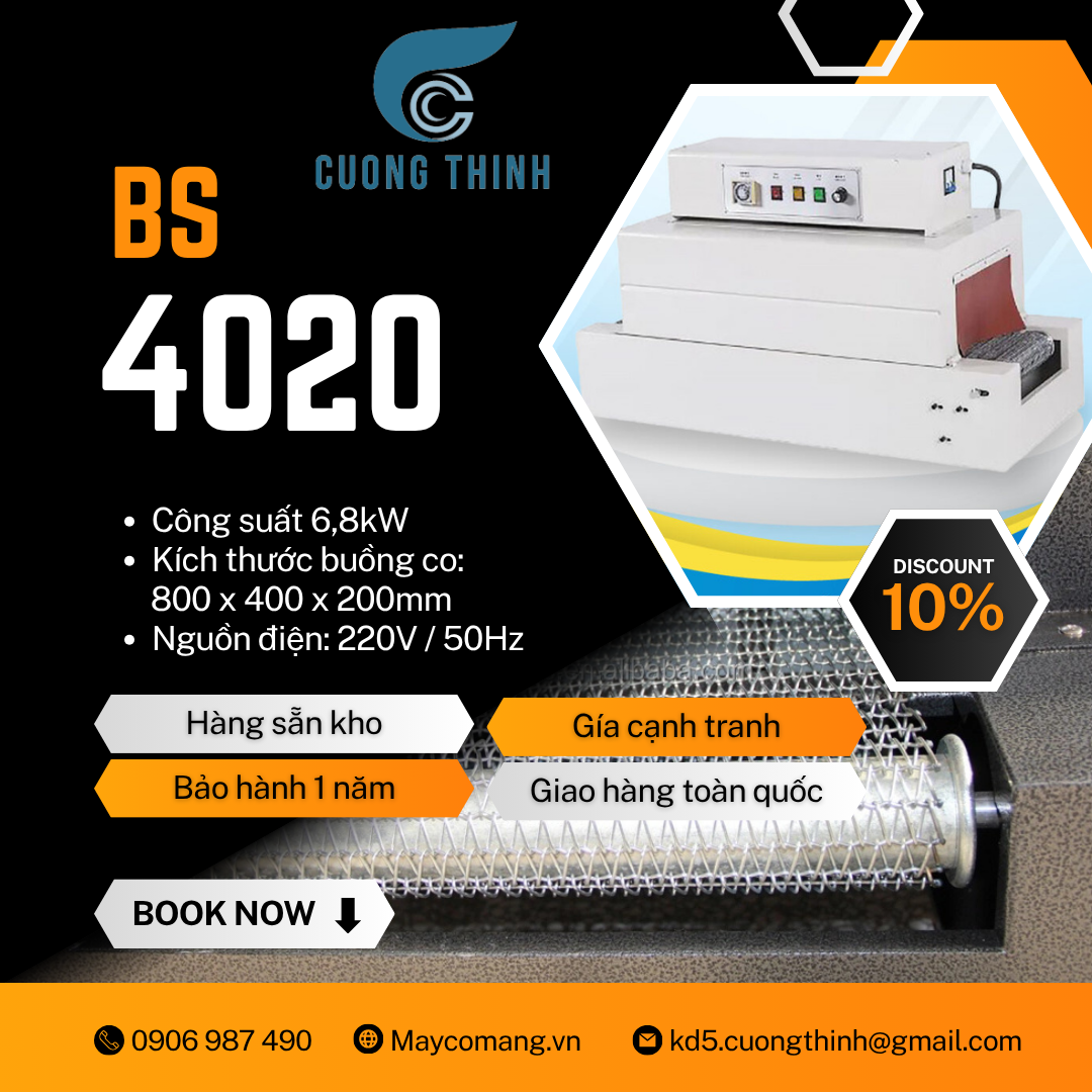 THÔNG SỐ CƠ BẢN: • Công suất 6,8kW • Công suất đóng gói 0-15 sp/phút • Kích thước buồng co: 800 x 400 x 200mm • Nguồn điện: 220V / 50Hz • Trọng lượng máy: 50kg • Loại màng dùng: POF / PVC