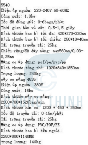 MÁY 5540 – 4535 BÁN TỰ ĐỘNG CHUYÊN DÙNG CHO MÀNG CO PE Máy bọc màng co PE 5540 – 4535 gồm 2 máy: Máy cắt màng co PE 5540 • Điện áp nguồn: 220V, 50Hz • Công suất: 1.8kW • Tốc độ đóng gói: 0-6 sp/phút • Kích thước tổng thể: 1020*840*1850mm • Trọng lượng: 240kg