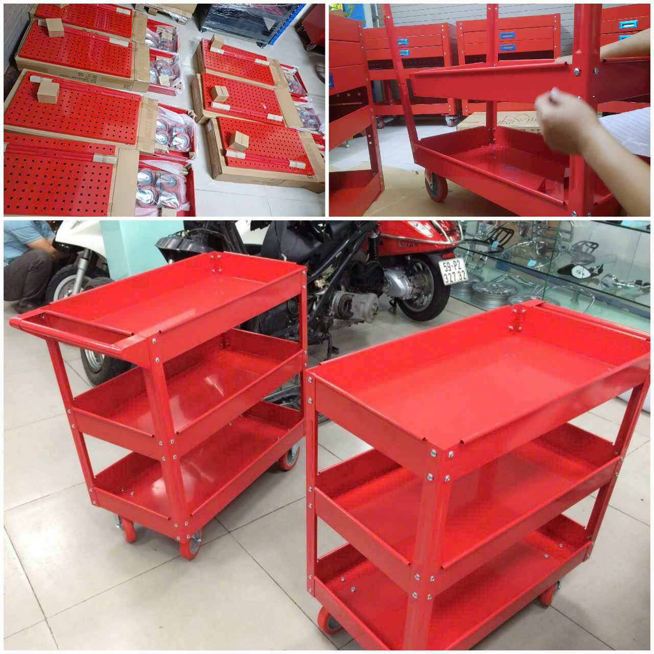 Xe đẩy dụng cụ 3 ngăn Xe đẩy dụng cụ ba ngăn là lựa chọn hoàn hảo cho những người cần không gian chứa nhiều hơn mà vẫn đảm bảo sự linh hoạt trong di chuyển. Với ba ngăn lớn, người dùng có thể dễ dàng phân loại và sắp xếp các công cụ. Từ các dụng cụ cầm tay nhỏ cho đến các thiết bị lớn hơn. Đặc biệt, xe đẩy này thường đi kèm với bánh xe chắc chắn. Giúp di chuyển nhẹ nhàng ngay cả khi chứa đầy dụng cụ. Thông số kỹ thuật: Chiều cao: 810 mm tính luôn cả bánh xe Chiều dài : 830 mm tính cả tay cầm Chiều rộng: 400 mm Khả năng chịu tải 150kg toàn xe