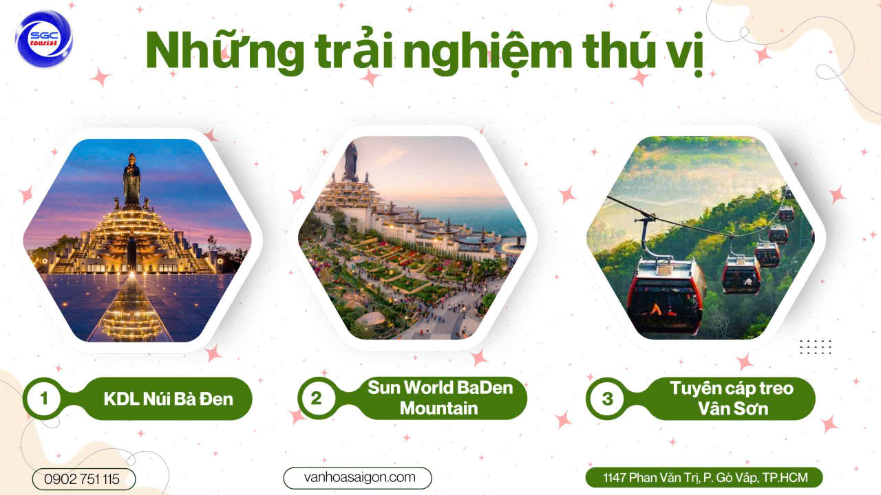 👉 Chỉ 1 ngày, bạn sẽ có ngay hành trình đầy trải nghiệm đặc sắc: 🚡 Chinh phục Tuyến cáp treo Vân Sơn, ngắm toàn cảnh núi non hùng vĩ từ trên cao 🙏 Viếng KDL Núi Bà Đen, chiêm bái tượng Phật Bà cao nhất châu Á 🌸 Check-in Sun World BaDen Mountain với khung cảnh cực kỳ mãn nhãn 🍴 Thưởng thức Buffet Năm Châu hơn 80 món – ẩm thực đa dạng 5 châu hội tụ