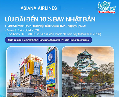 Asiana Airlines giảm 10% giá vé đi Nhật Bản Asiana Airlines giảm 10% giá vé đi Nhật Bản Asiana Airlines giảm 10% giá vé đi Nhật Bản – Thời gian mua vé : 1.4 ~ 30.4.2026 -Thời gian khởi hành : 1.4 ~ 30.09.2026* (Hoàn thành chuyến bay trước 30.11.2026) – TP. Hồ Chí Minh đến Nhật Bản : Osaka (KIX), Nagoya (NGO) – Áp dụng mức ưu đãi: Giảm 10% cho Hạng phổ thông và 5% cho Hạng thương gia. – Không bao gồm mùa cao điểm (17.7 ~ 14.8.2026) Bảng giá vé máy bay giảm 10% giá vé mùa xuân đi Quốc tế của Asiana Airlines ĐI ĐẾN GIÁ VÉ Tp.HCM Nagoya (NGO) 8.500.000 Tp.HCM Osaka (KIX) 6.800.000 *Lưu ý: Giá vé máy bay giảm 10% giá vé mùa xuân đi Quốc tế của Asiana Airlines chưa bao gồm thuế và phụ phí có thể thay đổi bất kỳ lúc nào.