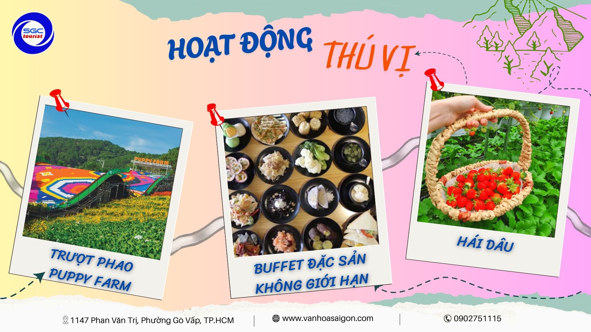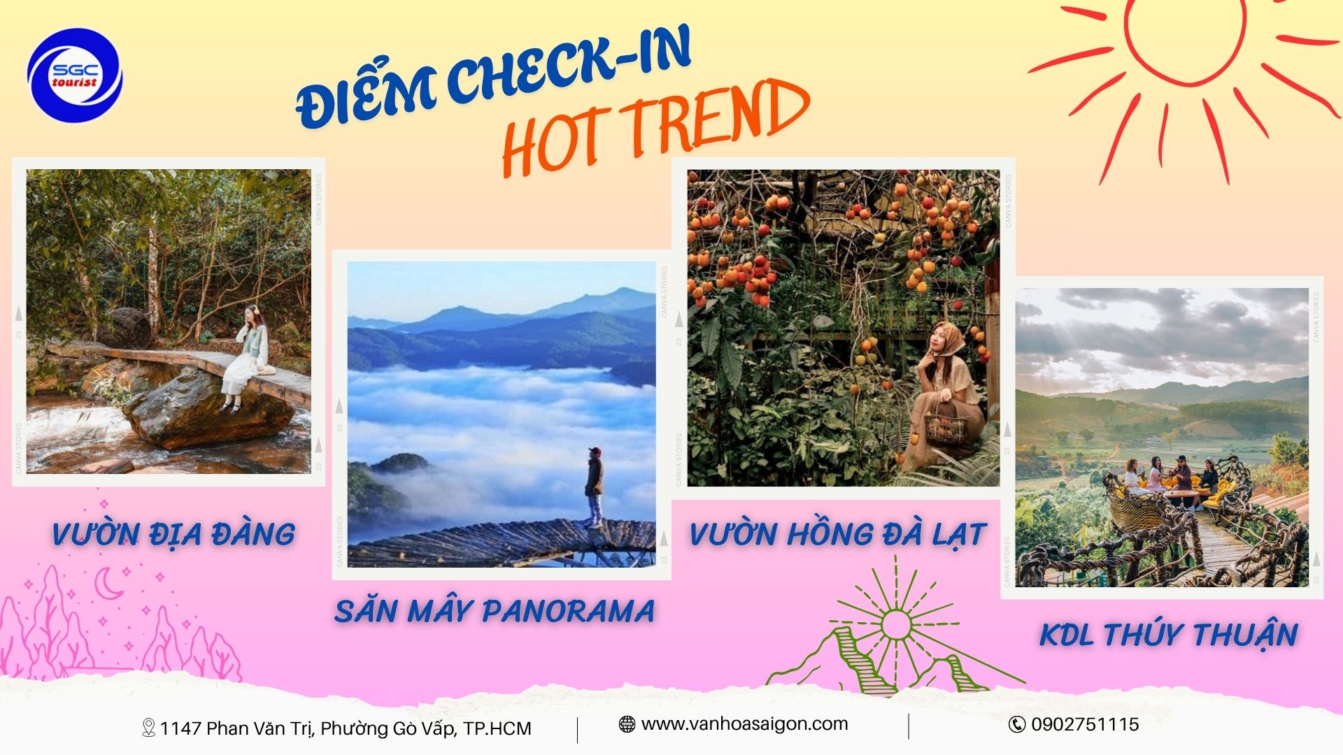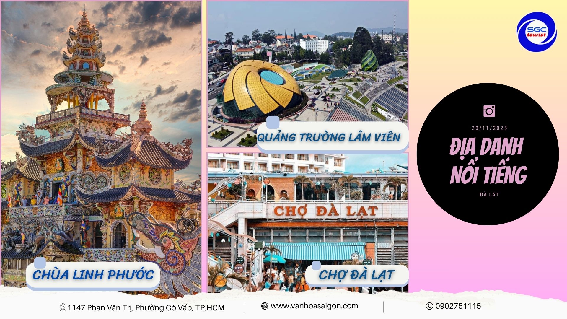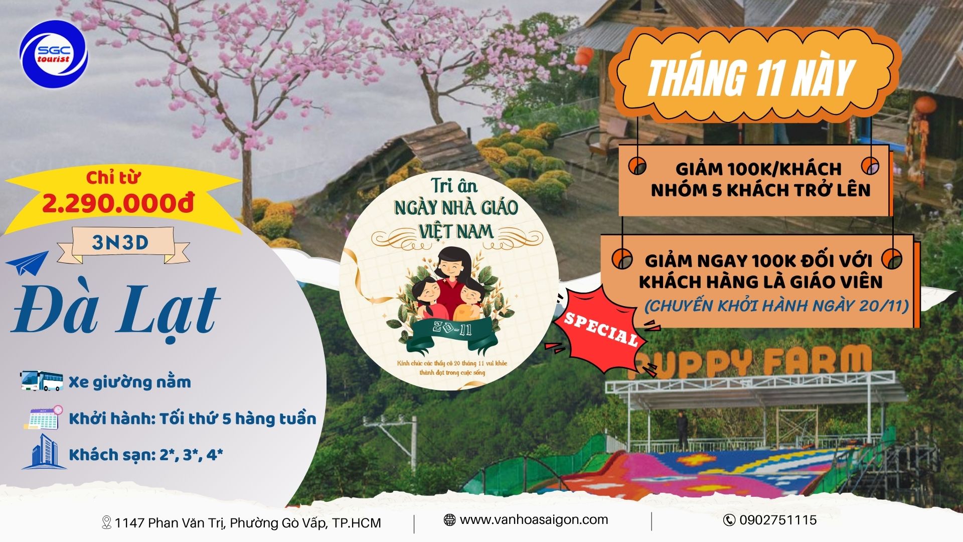 🎉 THÁNG 11 ĐANG TRÔI QUA NHƯNG DEAL VẪN CHƯA BAY! 🎉 💥 Team nào chưa đi Đà Lạt tháng 11 là thiệt nhaaa! 💥 SGC Tourist vẫn còn chiêu đãi siêu bốc cho những ai “đi đông cho vui”: 👉 Giảm ngay 100.000đ/khách khi đăng ký nhóm từ 5 người trở lên 💰 Giá chỉ từ 2.290.000đ/người – tour Đà Lạt 3N3Đ siêu chill 🌸 🚍 Xe giường nằm ru ngủ tận nơi 🏨 Khách sạn 2*, 3*, 4* tùy gu sang chảnh 🕓 Khởi hành: Tối thứ 5 hằng tuần 🎓 Đặc biệt dành tặng “những người lái đò” trong tháng 11 này 👉 Giáo viên được tặng thêm 100.000đ/khách nếu tham gia chuyến Đà Lạt 20/11 🎁 Cả Đà Lạt đang khoe sắc, mà bạn còn nằm nhà thì… tiếc lắm á! 😆 Rủ hội bạn thân, đồng nghiệp hoặc người thương book liền tay – kẻo deal bay mất! 📞 Hotline: 0902.751.115 🌐 www.vanhoasaigon.com 📍 1147 Phan Văn Trị, P. Gò Vấp, TP.HCM