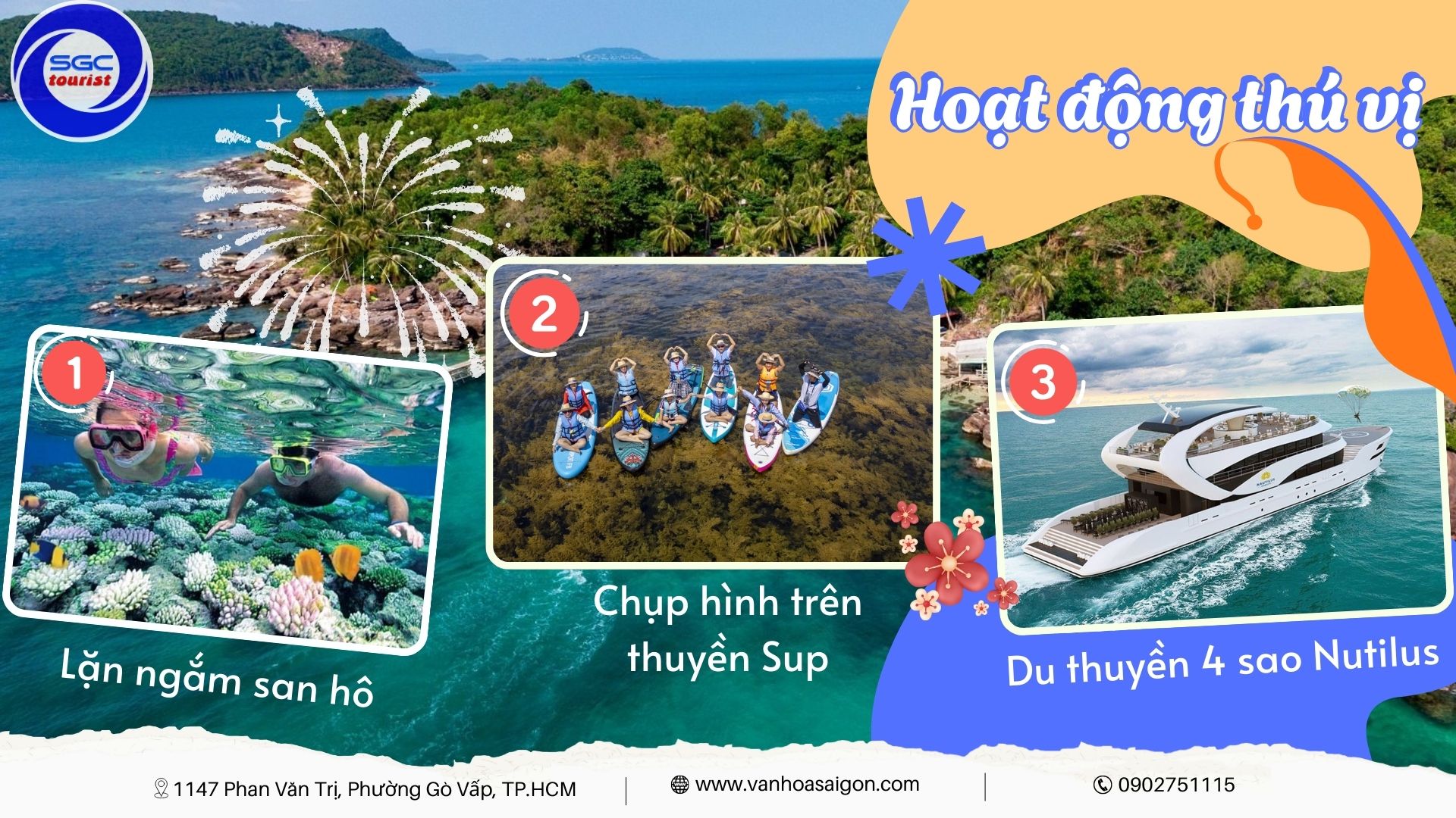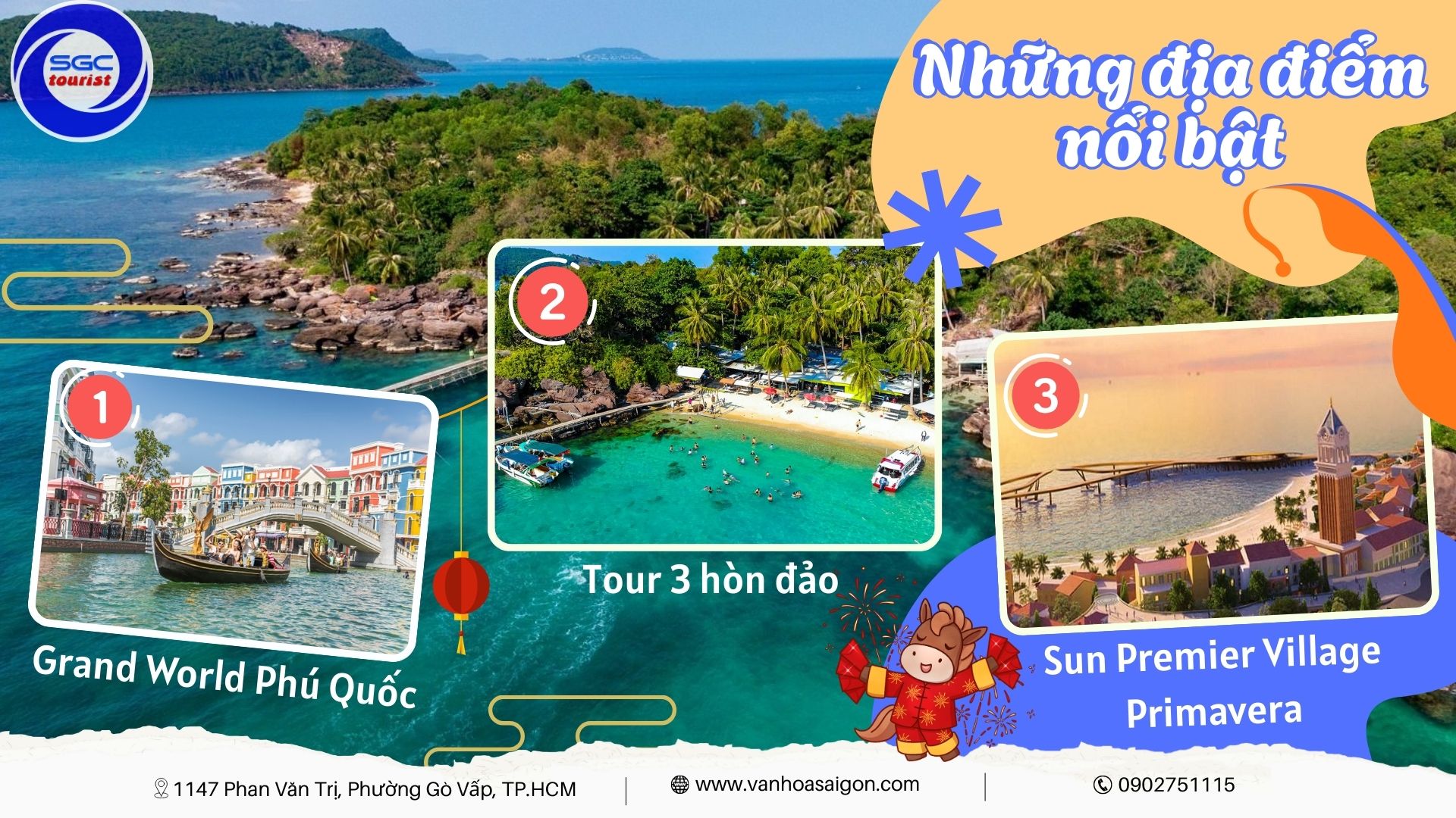 🌟 Đi Phú Quốc dịp Tết có gì HOT? 🌿 KDL Suối Tranh: Một điểm chill nhẹ giữa rừng để mở đầu hành trình 🏖️ Tour 3 đảo: Hòn Móng Tay – Hòn Mây Rút – Hòn Gầm Ghì 🤿 Lặn ngắm san hô, chèo thuyền sup: tận hưởng sự lênh đênh giữa biển khơi 🌅 Bãi Sao - bãi biển đẹp nhất Phú Quốc Cát trắng – biển trong – góc nào cũng chụp hình siêu xịn. 🏰 Grand World – Venice phiên bản Việt: Đèn lên là lung linh như trời Âu 🌆 Thành phố Địa Trung Hải – Sun Premier Primavera