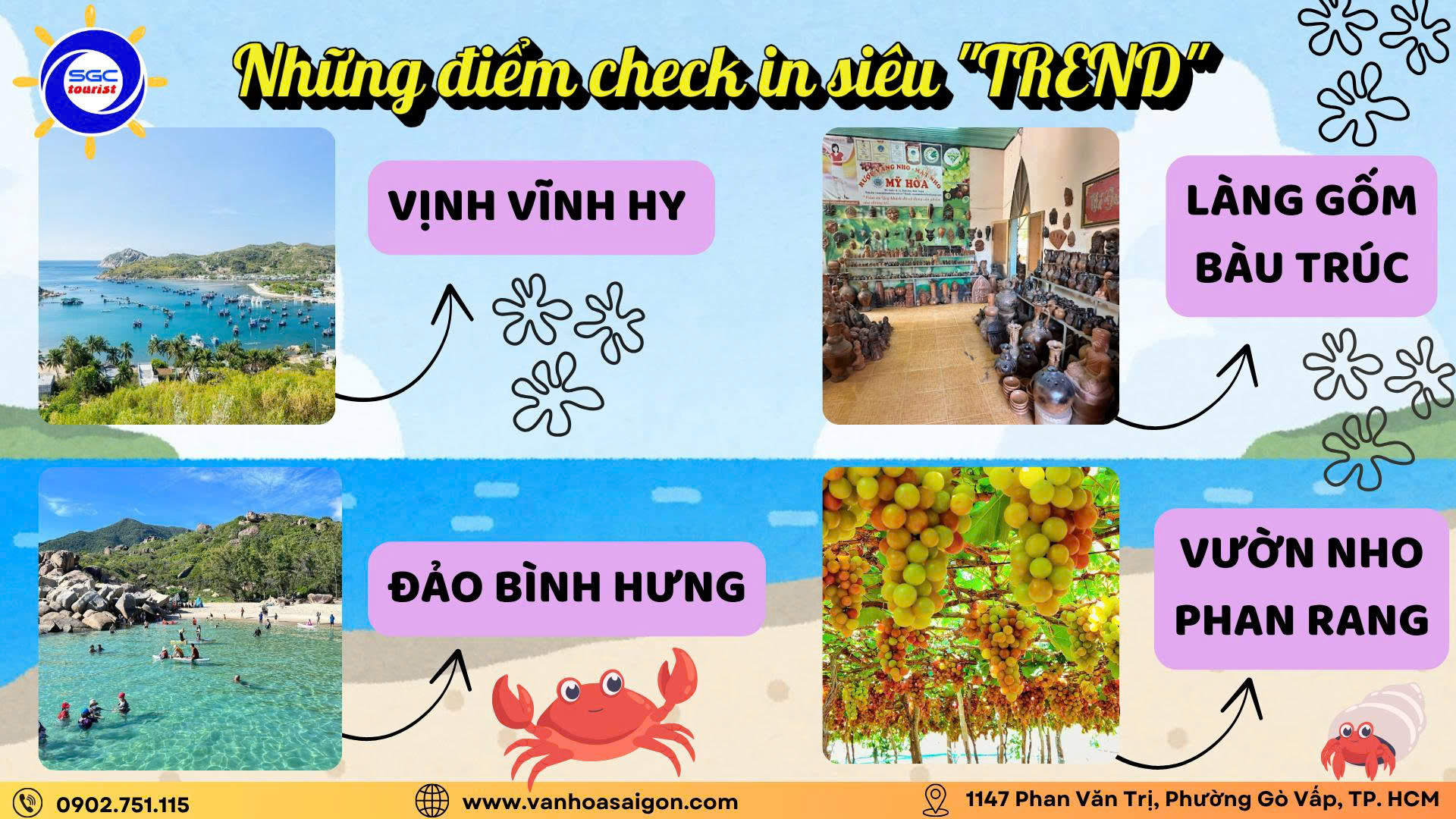 📸 Check-in loạt điểm siêu hot: • Đảo Bình Hưng – biển xanh, bãi cát trắng • Vịnh Vĩnh Hy – một trong 4 vịnh đẹp nhất Việt Nam • Làng gốm Bàu Trúc – làng nghề Chăm cổ • Vườn nho Phan Rang – tha hồ chụp ảnh & thưởng thức nho
