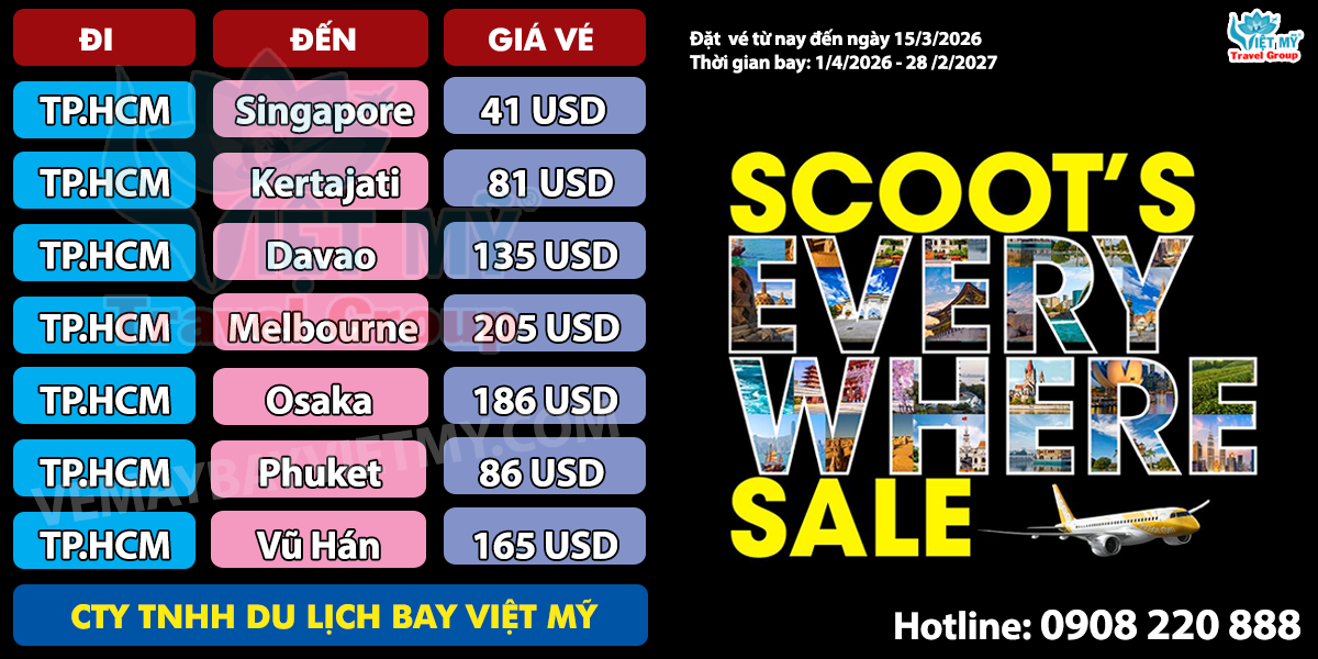 FlyScoot ưu đãi vé máy bay đi Quốc tế FlyScoot ưu đãi vé máy bay đi Quốc tế FlyScoot ưu đãi vé máy bay đi Quốc tế Bạn sẽ đi đâu tiếp theo? Với Scoot’s Everywhere Sale hiện đang được giảm giá, ghi điểm những khuyến mãi tuyệt vời từ $41usd đến hơn 70 điểm đến. Sẵn sàng chưa? Hãy Scoot! Đặt trước khi giảm giá kết thúc vào ngày 15 tháng 3 năm 2026 Thời gian di chuyển: 1 tháng 4 năm 2026 – 28 tháng 2 năm 2027 Một chiều, chưa bao gồm thuế. Áp dụng các điều khoản và kỳ du lịch. Khám phá nhiều điểm đến quốc tế hấp dẫn cùng FlyScoot Với mạng bay rộng khắp, Scoot hiện đang khai thác nhiều đường bay kết nối Việt Nam với các thành phố lớn tại châu Á và châu Âu.
