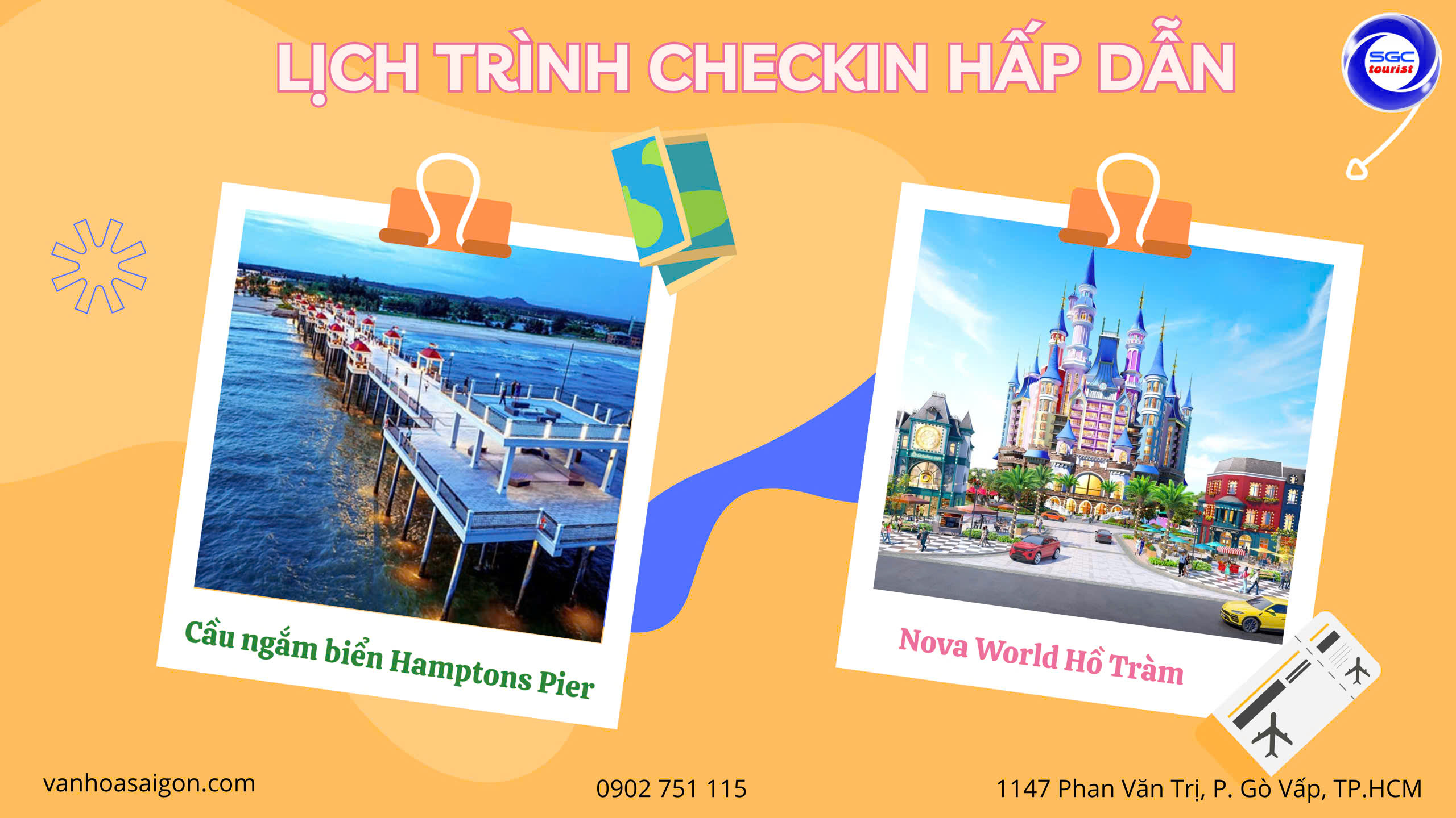 🚌 Lịch trình hấp dẫn: 📍 Khởi hành buổi sáng từ TP.HCM, check-in Cầu ngắm biển Hamptons Pier – cây cầu dài nhất Việt Nam vươn mình ra biển, background “triệu like”. 📍Tiếp tục khám phá NovaWorld Hồ Tràm – khu tổ hợp du lịch nghỉ dưỡng sang trọng với những gam màu châu Âu đầy cuốn hút. 📍Tự do tắm biển, dạo chơi, thưởng thức hải sản tươi ngon ven bờ.