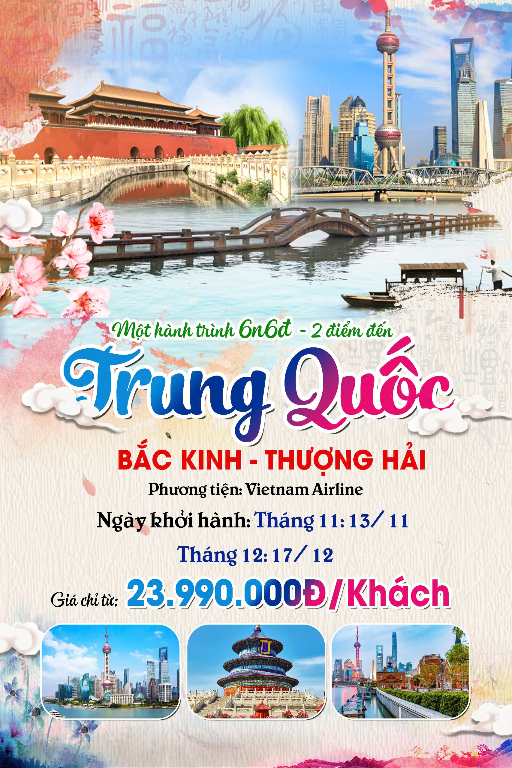 🧱 Vạn Lý Trường Thành – kỳ quan vĩ đại nhất thế giới, biểu tượng của Trung Hoa hùng cường. 🏰 Tử Cấm Thành (Cố Cung) – cung điện hoàng gia 9.999 gian lộng lẫy, nơi lưu dấu 500 năm lịch sử triều Minh – Thanh. 🇨🇳 Quảng Trường Thiên An Môn – trái tim chính trị của đất nước, rộng lớn và trang nghiêm. 🌿 Di Hòa Viên – cung điện mùa hè nổi tiếng với hồ Côn Minh, Tháp Dâng Hương và khu vườn hoàng gia tuyệt mỹ. 🐦 Sân vận động Tổ Chim & Thủy Lập Phương – biểu tượng Olympic Bắc Kinh 2008. ⛵ Du thuyền Tây Hồ – chiêm ngưỡng “Tây Hồ Thập Cảnh”, ngắm Tô Đê – Bạch Đê, Tam Đàn Ấn Nguyệt. 🍵 Thưởng thức trà Long Tĩnh – hương vị nổi tiếng đất Hàng Châu, xem biểu diễn pha trà nghệ thuật truyền thống. 🏠 Ô Trấn Tây Sách – Dạo bước giữa những con đường lát đá, cầu cổ, nhà gỗ bên dòng sông xanh – nơi lưu giữ hồn Giang Nam xưa. 🏙 Bến Thượng Hải – Tháp Truyền Hình Đông Phương Minh Châu – check-in toàn cảnh thành phố bên sông Hoàng Phố. 🛍 Phố Nam Kinh – thiên đường mua sắm sầm uất nhất Thượng Hải. 🌟 ĐIỂM NỔI BẬT: ✅ Bay thẳng Vietnam Airlines ✅ Tham quan 4 thành phố nổi tiếng nhất Trung Hoa: Bắc Kinh – Hàng Châu – Ô Trấn – Thượng Hải. ✅ Nghỉ khách sạn 4⭐ tiêu chuẩn Trung Quốc, vị trí trung tâm. ✅ Thưởng thức Vịt quay Bắc Kinh, lẩu Tứ Xuyên. ✅ Trải nghiệm tàu cao tốc Bắc Kinh – Hàng Châu 1.279 km, hiện đại & tiết kiệm thời gian. 📅 KHỞI HÀNH (TP.HỒ CHÍ MINH): 💮 Tháng 11: 13/11 👉 23.990.000đ 💮 Tháng 12: 17/12 👉 23.990.000đ