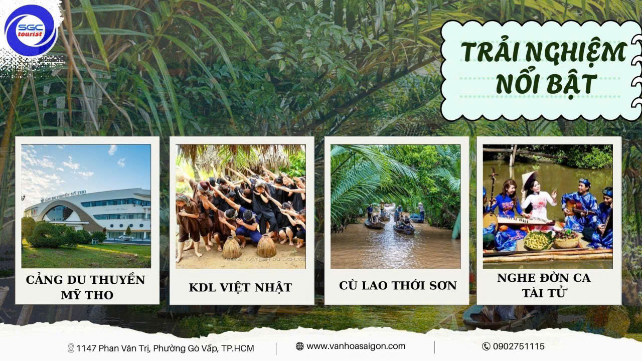 🌟 TRẢI NGHIỆM NỔI BẬT KHÔNG THỂ BỎ QUA: 🚤 Cảng Du Thuyền Mỹ Tho – lên thuyền du ngoạn sông Tiền, ngắm 4 cù lao Long – Lân – Quy – Phụng 🌳 KDL Việt Nhật – trải nghiệm trò chơi dân gian "quốc dân": cầu khỉ, đu dây, chèo xuồng,… hoàn toàn miễn phí 🍃 Cù Lao Thới Sơn – thử trà mật ong, tham quan vườn bưởi hơn 5.000m2 🎶 Đờn Ca Tài Tử – nghe đờn ca truyền thống, thưởng thức trái cây miền Tây 🛶 Chèo xuồng len lỏi dừa nước – “đặc sản” check-in miệt vườn 🐴 Xe ngựa đường quê – cảm nhận đời sống người dân bản xứ 🍬 Lò kẹo dừa Bến Tre – xem quy trình làm kẹo đặc sản truyền thống