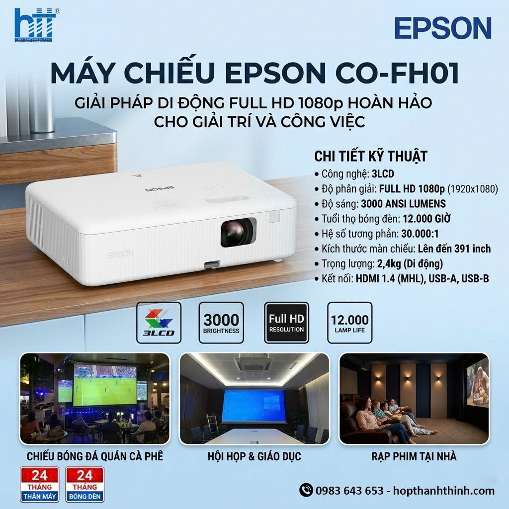 📺 Độ phân giải: Full HD 1080p (công nghệ 3LCD) 💡 Độ sáng: 3000 ANSI Lumens 📏 Kích thước chiếu: Lên đến 391 inch ⏳ Tuổi thọ bóng đèn: ~12.000 giờ ⚖️ Trọng lượng: 2.4kg (dễ mang theo) 🔌 Kết nối: HDMI, USB (Laptop, TV Box…)