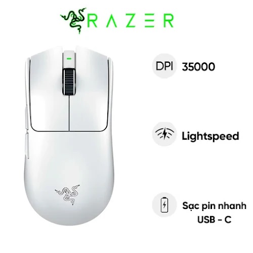 ⚙️ Thông số kỹ thuật: • Cảm biến: Razer Focus Pro 35K Optical – Độ chính xác 99.8% • Độ phân giải: Tối đa 35.000 DPI, điều chỉnh cực mượt • Tốc độ phản hồi: 8000Hz HyperPolling Wireless (1ms) • Kết nối: Razer HyperSpeed Wireless / Dây USB-C • Nút bấm: 6 nút lập trình – Switch quang học Gen-3 (tuổi thọ 90 triệu lần nhấn) • Thời lượng pin: Lên đến 95 giờ (HyperSpeed) • Trọng lượng: 63g – siêu nhẹ, linh hoạt tuyệt đối • Thiết kế: Đối xứng, ôm tay, tối ưu cho game thủ FPS chuyên nghiệp • Tương thích: Windows / macOS / Razer Synapse