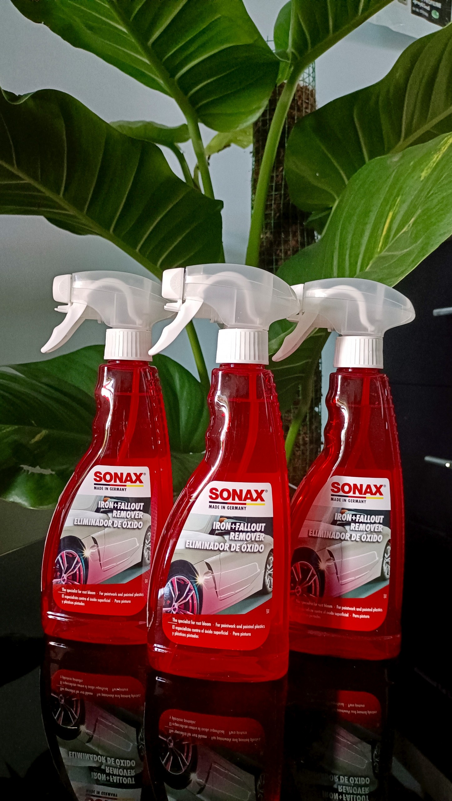 - Phun sonax fallout cleaner lên khu vực cần làm sạch. Để 3-5 phút dung dịch chuyển sang màu đỏ. Sau đó, rửa thật sạch bằng nước. Có thể làm lại nếu cần.