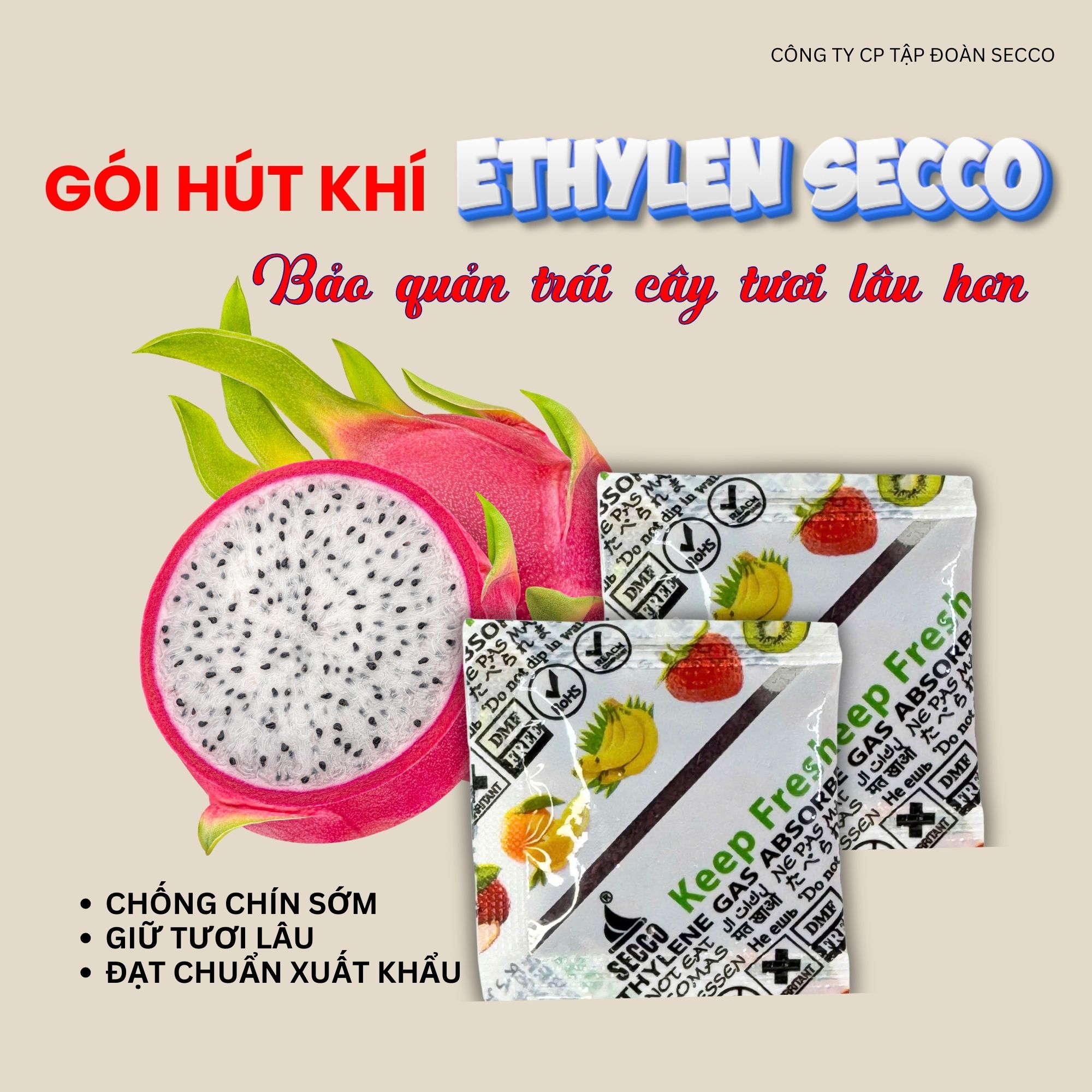 Gói Hút Khí Ethylene KEEP FRESH SECCO – Bảo quản trái cây tươi, nông sản lâu hơn mỗi ngày. Gói hút khí Ethylene SECCO giúp hấp phụ hiệu quả khí Ethylene – tác nhân gây chín nhanh, rụng lá và hư hỏng ở trái cây, nông sản. Giải pháp bảo quản không hóa chất, an toàn và thân thiện môi trường, phù hợp cho trái cây tươi và nông sản xuất khẩu. 🔹 Ưu điểm nổi bật Hấp phụ khí Ethylene mạnh mẽ, giúp làm chậm quá trình chín ở trái cây, nông sản, giảm rụng lá, giảm hao hụt nông sản. Bảo quản tự nhiên, không hóa chất, không ảnh hưởng đến chất lượng trái cây, nông sản. Phù hợp cho bảo quản trái cây tươi và nông sản xuất khẩu. Đạt chuẩn: ISO 9001:2015, ISO 15378:2017, REACH, RoHS, HACCP, DMF Free,… 🎯 SECCO cam kết Hiệu quả ổn định – Đáp ứng yêu cầu bảo quản trái cây, nông sản khắt khe. Hàng luôn có sẵn – Giao nhanh toàn quốc. Giá cạnh tranh – Tư vấn tận tâm theo từng loại trái cây, nông sản. LIÊN HỆ NGAY CÔNG TY CP TẬP ĐOÀN SECCO #goihutethylene #chongchinsom #giutuoilau #Secco #baquannongsan #traiCayXuatKhau #keepfresh #thanhlong #traicaytuoi