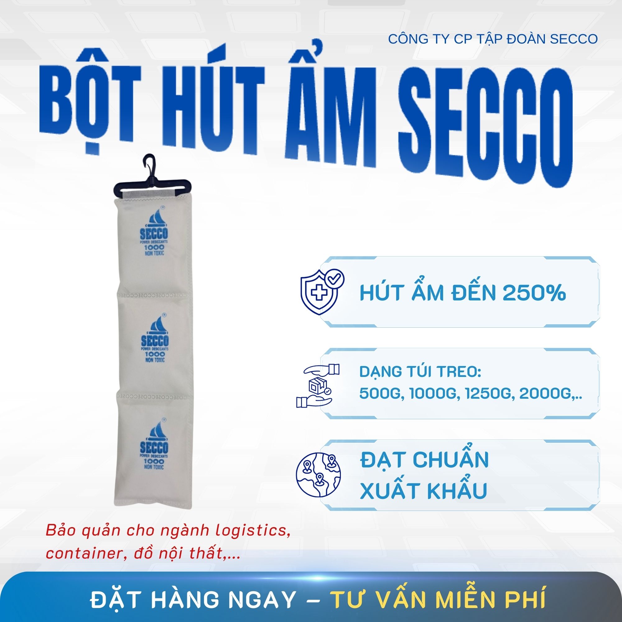 Bột Hút Ẩm - Bột Chống Ẩm Secco Chuyên Dùng để bảo hàng hóa xuất khẩu cho ngành Điện tử, Máy máy thiết bị - Chống ẩm mốc trong quá trình vận chuyển và lưu kho - Hút ẩm hiệu quả lên đến 250% - Giá thành tiết kiệm gấp 8 lần Silicagel - Đa dạng kích thuocs dạng túi treo: 500g, 1000g, 1250g, 2000g,... - Giá cạnh tranh tại nhà máy Liên hệ ngay để được tư vấn và nhận mẫu thử miễn phí CÔNG TY CP TẬP ĐOÀN SECCO #bothutam #bothutamtreocontainer #bothutamsecco1000g #bothutamsecco1kg
