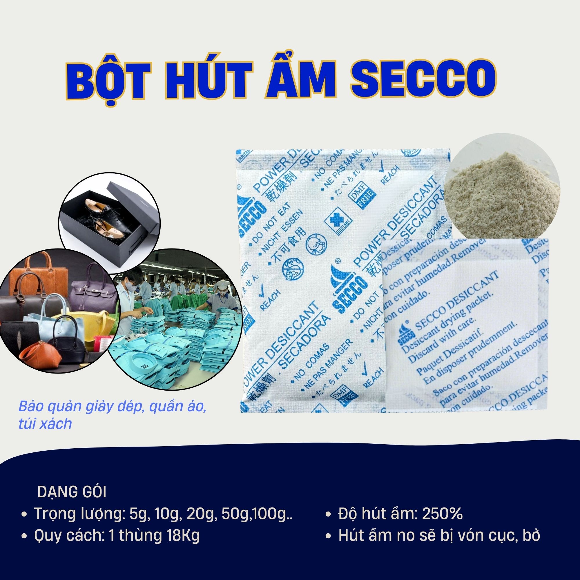 Trong ngành may mặc và da giày, một chút hơi ẩm tồn dư cũng đủ gây nên mùi hôi, ố vàng hoặc nấm mốc trên vải vóc. Gói bột hút ẩm Secco 5g chính là giải pháp tinh tế và hiệu quả nhất để bảo vệ từng món đồ của bạn từ trong túi nilon đến khi tới tay khách hàng.