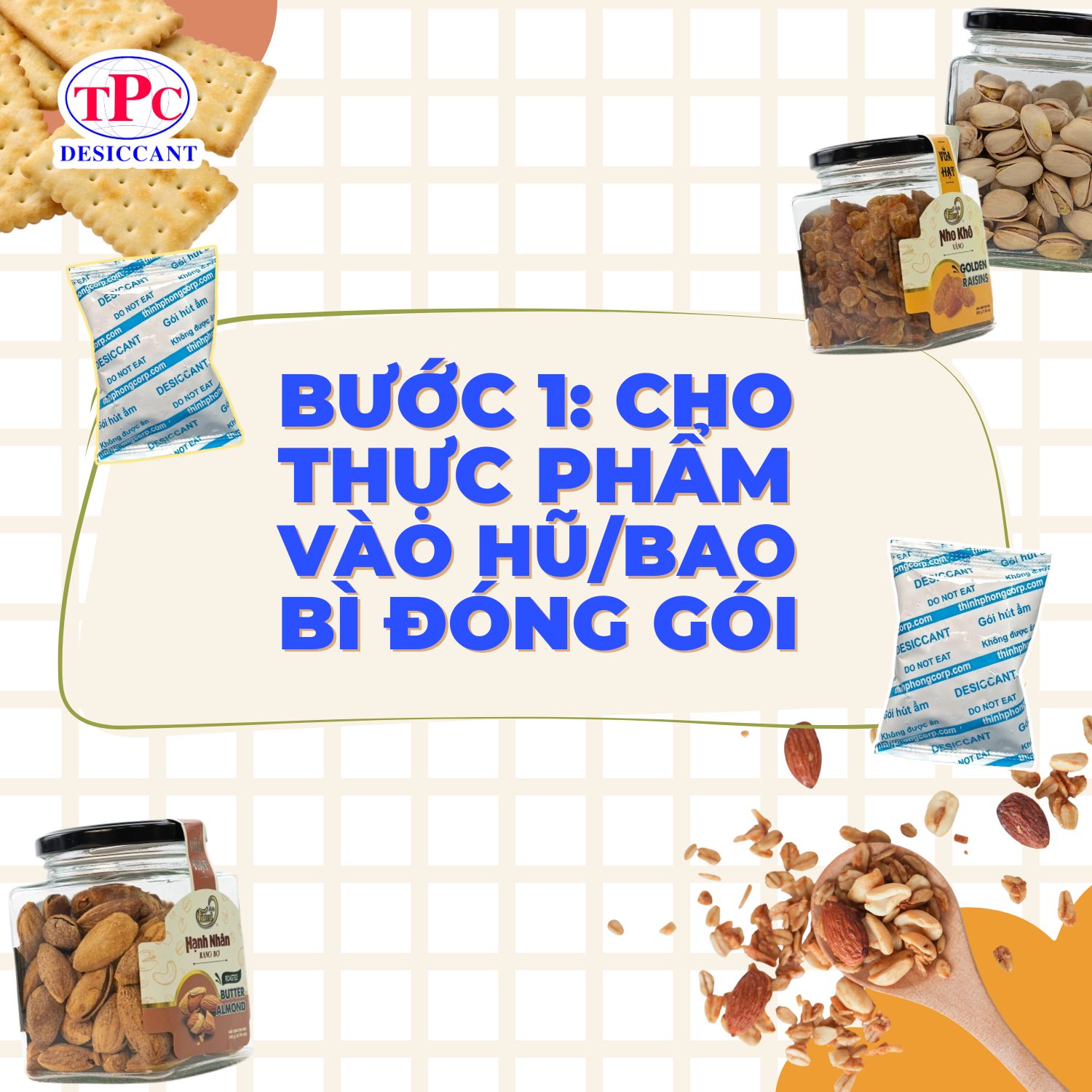 Bước 1: Cho thực phẩm vào hũ hoặc bao bì cần đóng gói. Bước 2: Đặt ngay 1 gói hút ẩm Clay OPP Thịnh Phong vào bên trong. Bước 3: Hàn kín miệng bao hoặc hút chân không lại. Vậy là hoàn tất quy trình chống ẩm cực nhanh cho mọi loại thực phẩm.