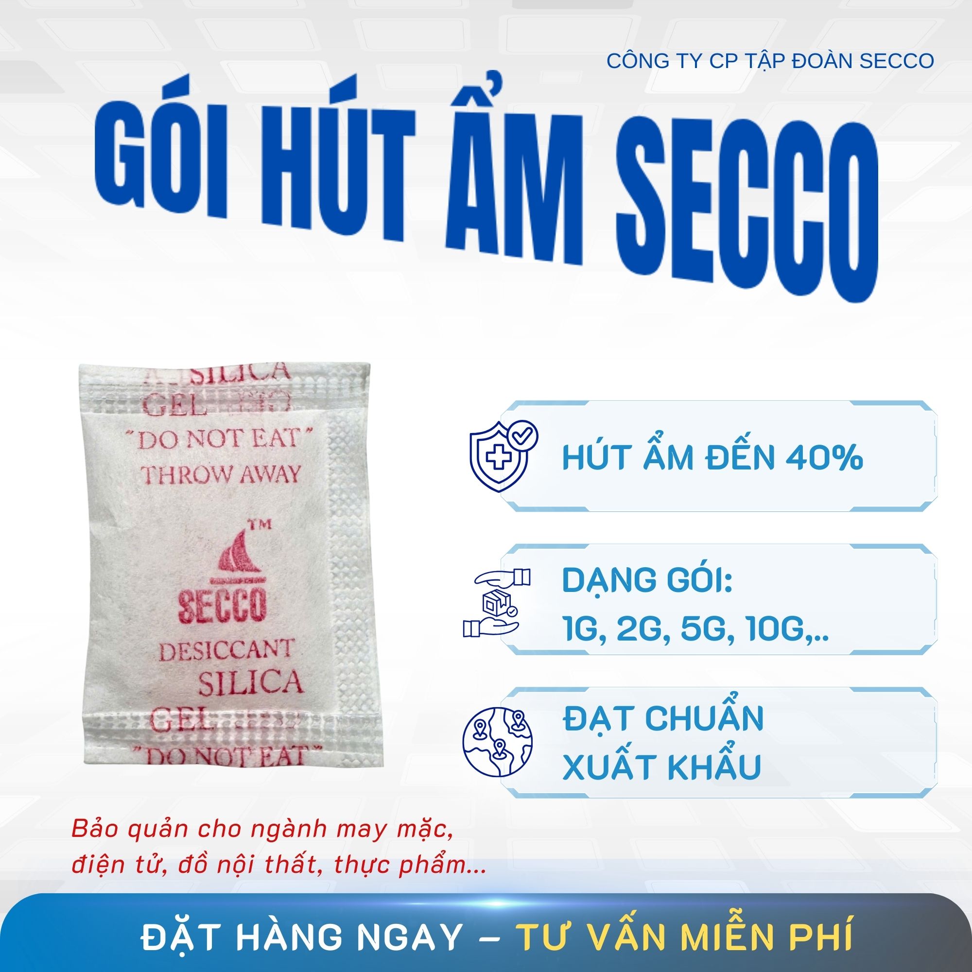 Gói Hút Ẩm/ gói chống ẩm/ hạt chống ẩm Silicagel Secco - Bảo quản cho đa dạng ngành nghề Đồ gỗ, nội thất, quần áo túi xách, thực phẩm, linh kiện điện tử - Hút ẩm nhanh chóng giúp hàng hóa khô thoáng trong quá trình lưu kho và vận chuyển - giá tốt cạnh tranh tại nhà máy - đa dạng size hàng: 1g 2g 5g 10g 100g đến 1000g - có sẵn SLL - đạt chuẩn xuất khẩu