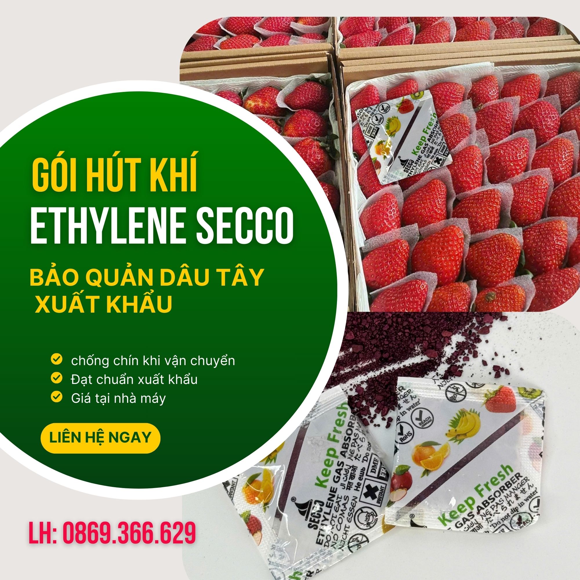 Gói Hút Khí Ethylen Secco 5g Loại Bỏ Khí Ethylene, Đảm Bảo Trái Cây: Thanh Long/Xoài Giữ Độ Tươi Nguyên Vẹn Đến 30 Ngày! Gói hút khí Ethylene Secco là giải pháp hàng đầu cho nông sản của bạn: ✅ Chống chín sớm hiệu quả tức thì. ⏰ Giữ tươi lâu đến 30 ngày. 👍 Gói 5g nhỏ gọn tiết kiệm, dễ dàng sử dụng. 🌍 Chất lượng đạt chuẩn xuất khẩu quốc tế. Liên hệ tư vấn mua hàng và nhận mẫu miễn phí: 0975 778 400.