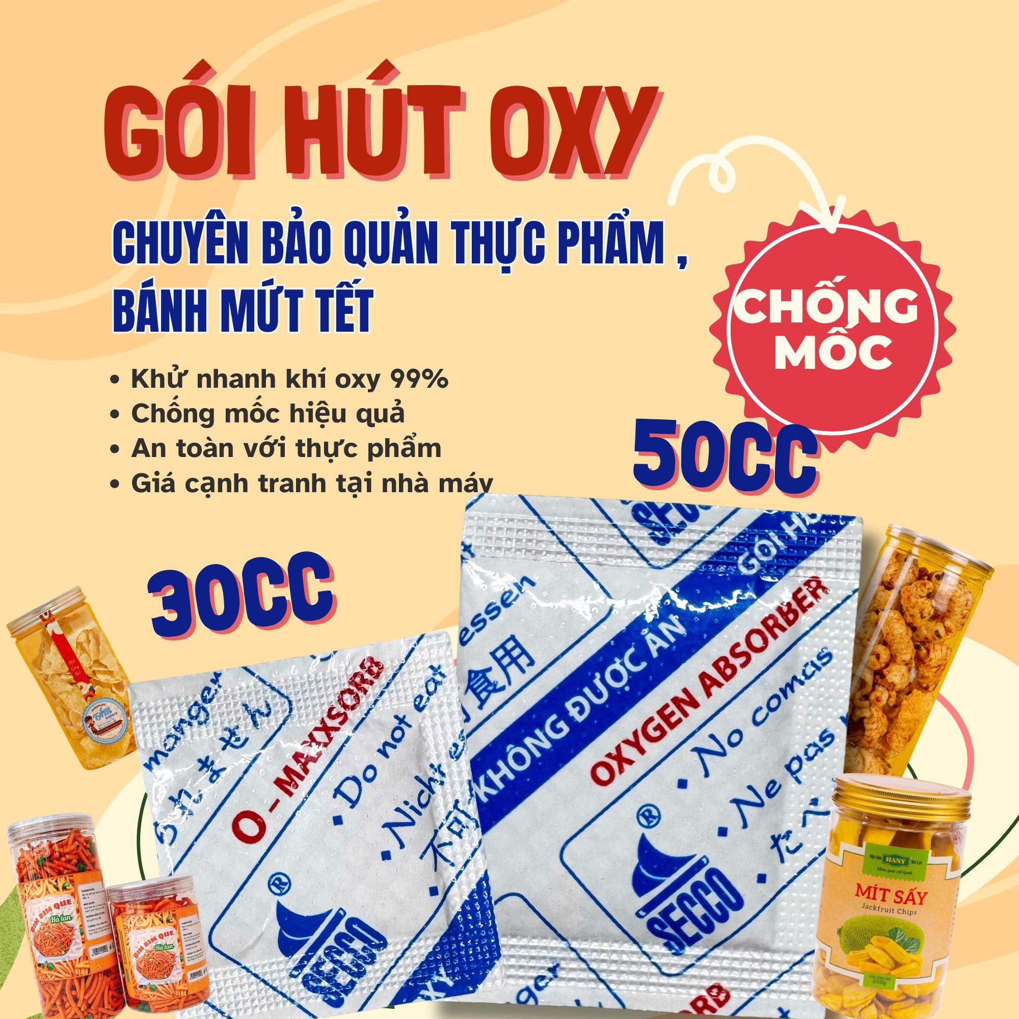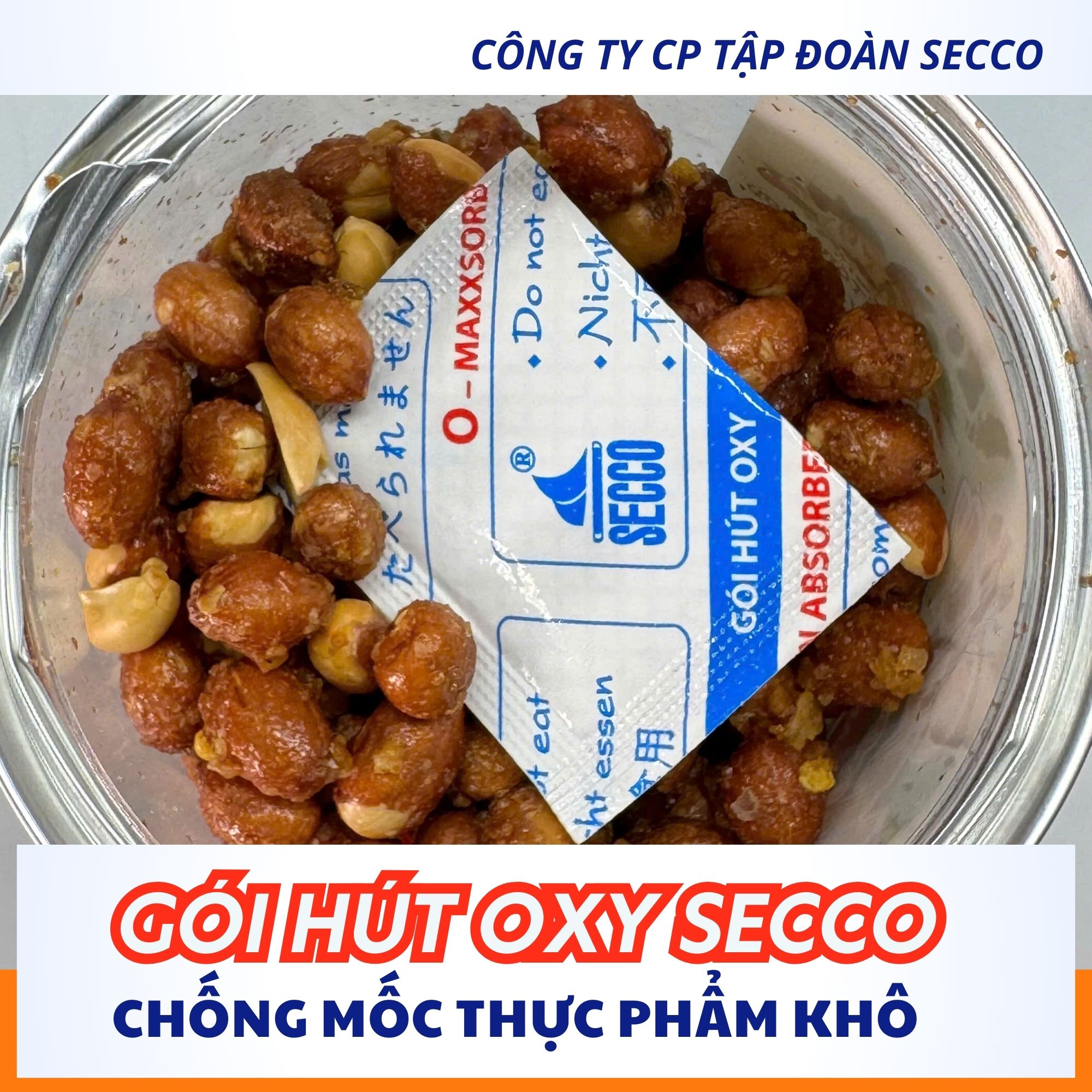 Để thực phẩm giữ được độ tươi ngon, không bị nấm mốc hay hôi dầu, việc sử dụng gói hút Oxy đúng cách là yếu tố quyết định. Dưới đây là hướng dẫn chi tiết từ Tập đoàn Secco dành cho các cơ sở sản xuất. -Gói 50cc: Bánh Trung thu, Bánh Pía, bánh bông lan trọng lượng từ 200g - 500g. -Gói 100cc: Hũ hạt điều, mứt trái cây lớn, thịt bò khô, cá khô). trọng lượng từ 500g - 700g HDSD: Bước 1: Chuẩn bị bao bì cần đóng gói hút oxy
