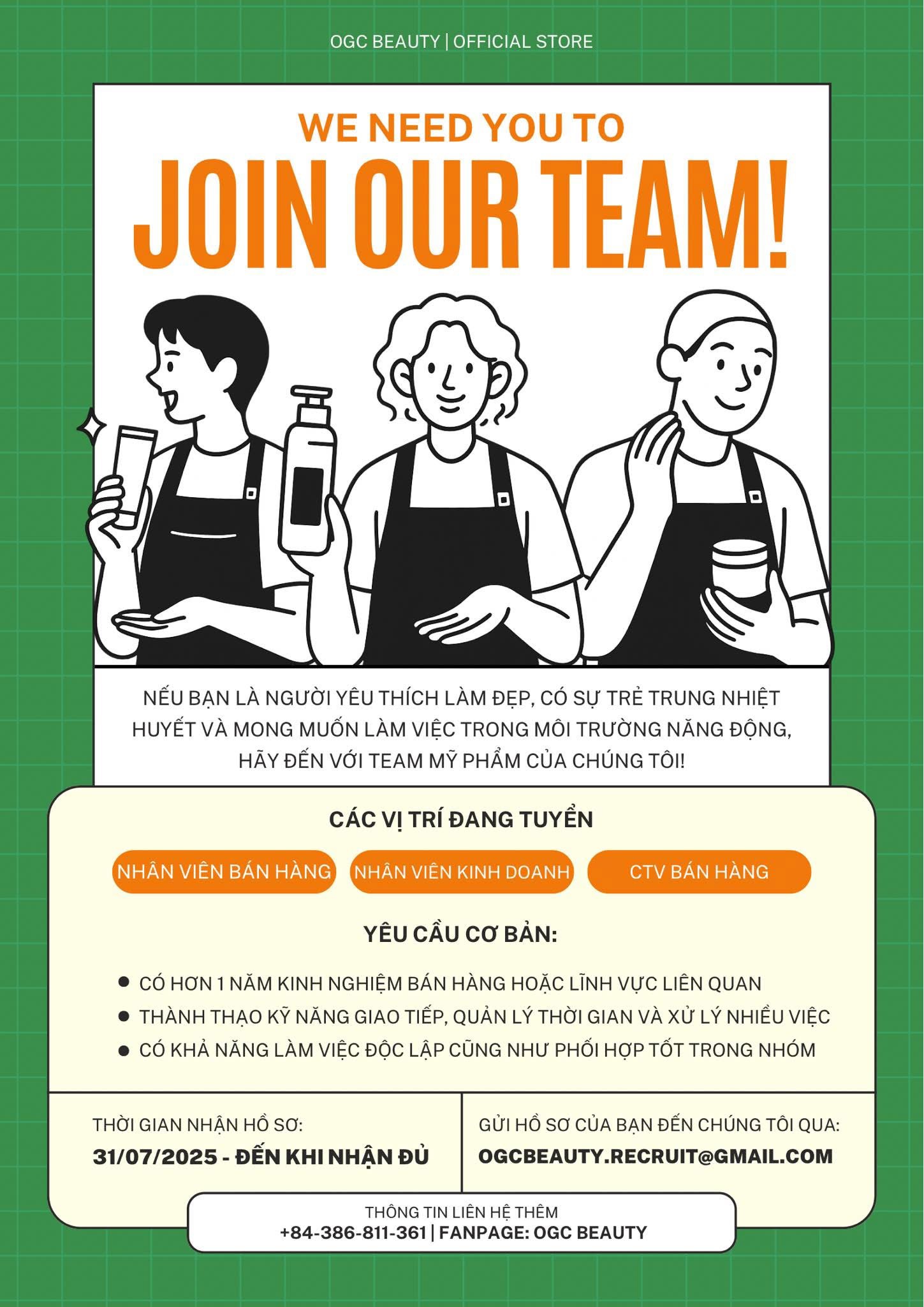 Vị trí: Nhân viên bán mỹ phẩm Thời gian làm việc: linh hoạt theo ca (hoặc full-time) Sáng: 7h30 - 11h30 Chiều: 13h00 - 17h00