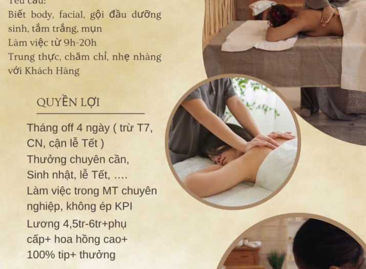 Lạc Viên Spa Đc: 7/2 Nguyễn Thị Minh Khai, Q1, HCM Tuyển Dụng đồng đội dễ thương đi làm vào giữa tháng 11 Kỹ Thuật Viên Spa : 05 Yêu cầu : - Biết body, facial, tắm trắng, gội dưỡng sinh, mụn - Trung thực, chăm chỉ, nhẹ nhàng với KH - Làm việc từ: 9h-20h Quyền lợi: - Off 4n/tháng ( trừ T7,CN, cận lễ Tết ) - Thưởng chuyên cần, lễ Tết, sinh nhật - Được làm việc trong MT chuyên nghiệp - Lương 4,5tr-6tr ( tuỳ tay nghề )+phụ cấp+hoa hồng cao+ 100% tip - Được đào tạo lại miễn phí - Không ép KPI, chỉ làm đúng nhiệm vụ KTV - Mấy bạn đọc kĩ yêu cầu, hẹn test tay nghề đúng giờ tránh mấy thời gian đôi bên. Liên hệ: 0961215154 - chị Như