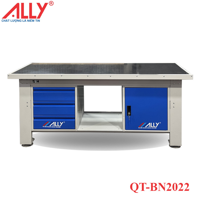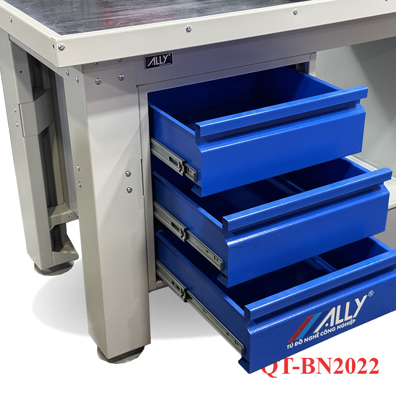 Model: ALLY QT-BN2022 Thương hiệu: ALLY (Việt Nam) Kích thước: 00 × 750 × 850 mm Tải trọng: Có biến thể chịu đến 1.000 kg hoặc 2.000 kg Mặt bàn: Thiết kế 3 lớp dày 50 mm – gồm gỗ cao su 36 mm, lớp cao su giảm rung 5 mm và thép tấm 10 mm. Hệ thống ngăn kéo / tủ: 3 ngăn kéo chịu tải & 1 hộc tủ Khung: Thép chấn định hình, sơn tĩnh điện chống gỉ. Chân bàn: Tăng đơ điều chỉnh chiều cao, giúp bàn cân bằng trên bề mặt sàn không đồng đều.